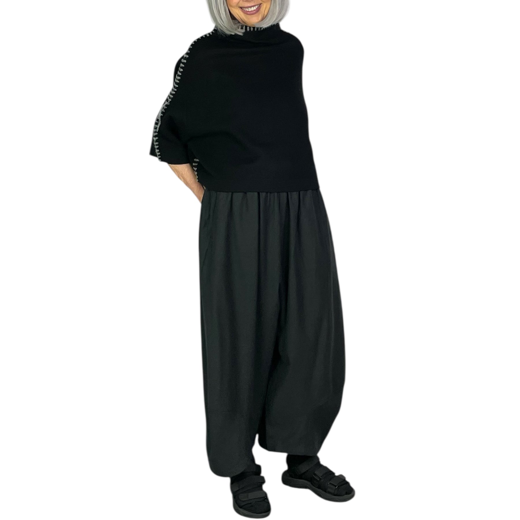 Half-sleeve hi-neck sweater with contrast whip stitching. Drop shoulders, cropped length.