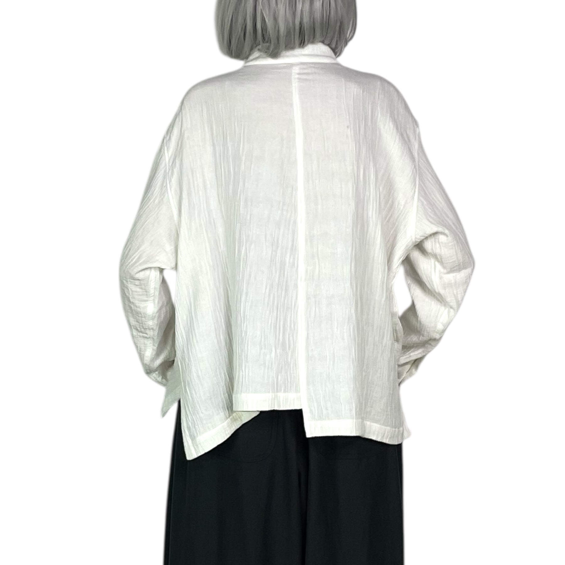 Long sleeve stand collar shirt with button front closure and barrel button cuffs. Asymmetric hemline with side slits. Double weight very soft cotton gauze fabric.