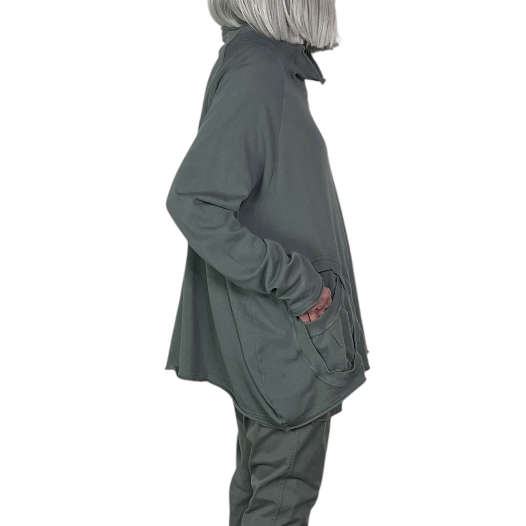 French terry tunic with a draped hi-neck and raglan long sleeves.  Single circle cut-out front pocket with ribbing trim. Raw rolled edges throughout, generous fit.
