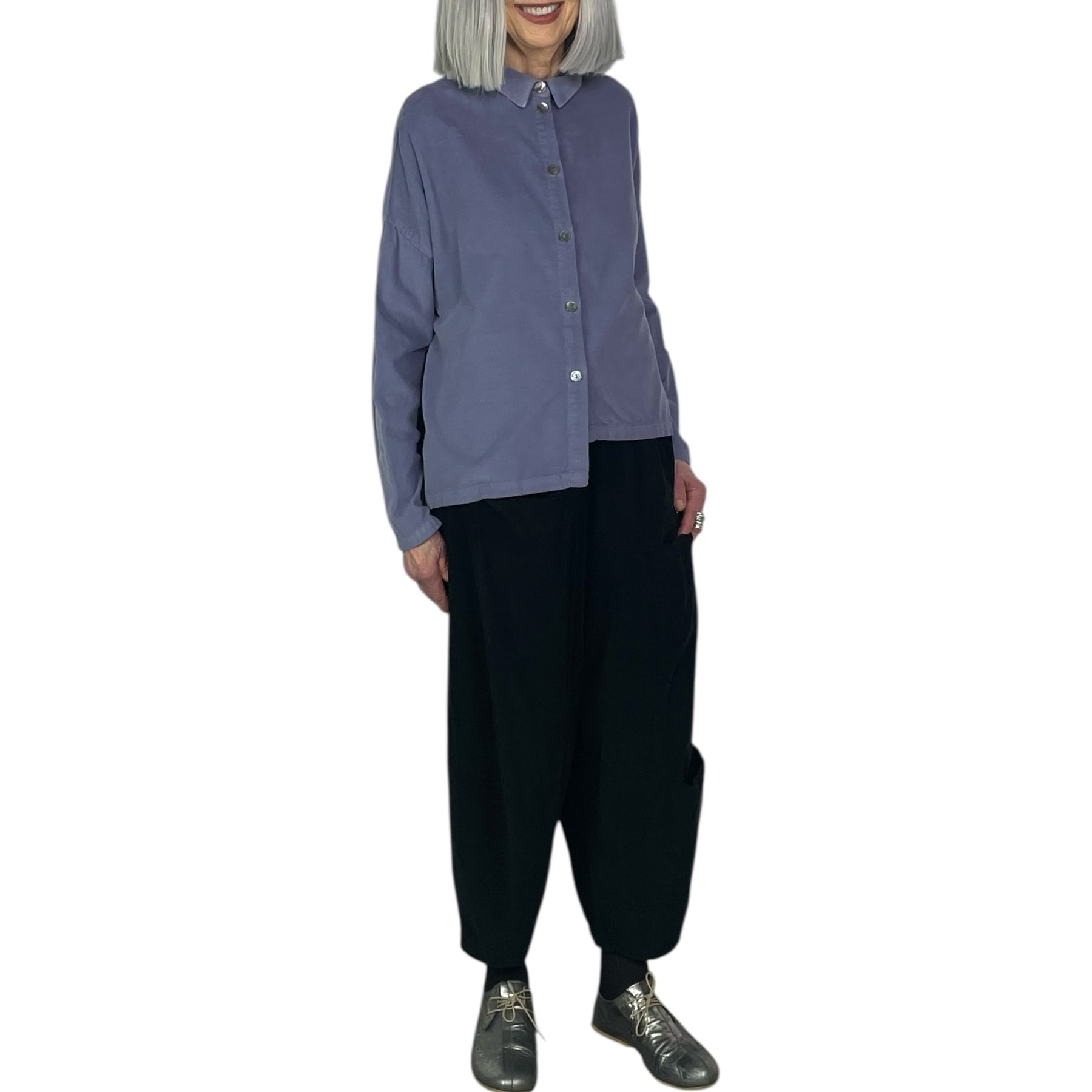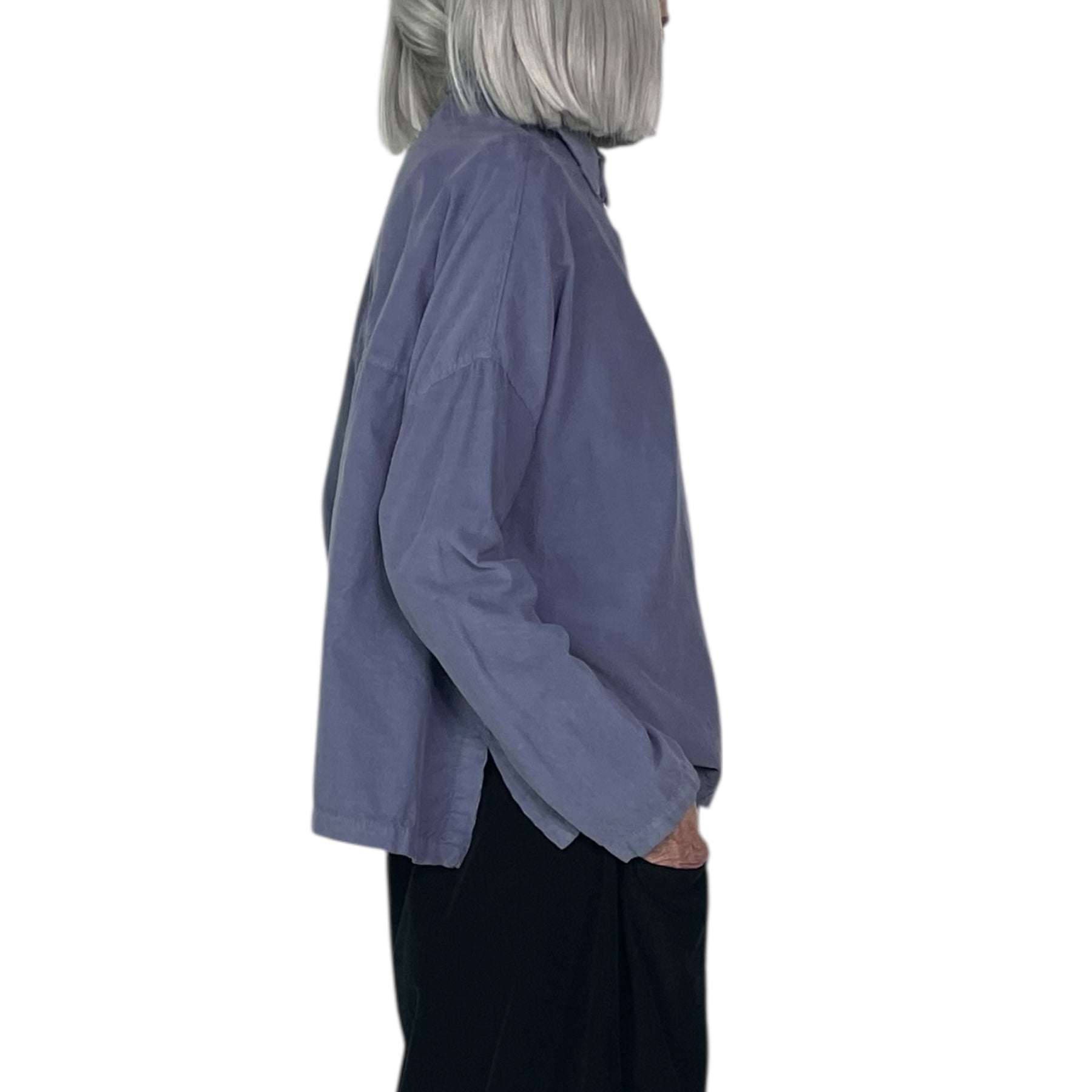 Baby corduroy long sleeve button front shirt. Shirt collar and drop shoulders.  Asymmetric hemline with side slits.
