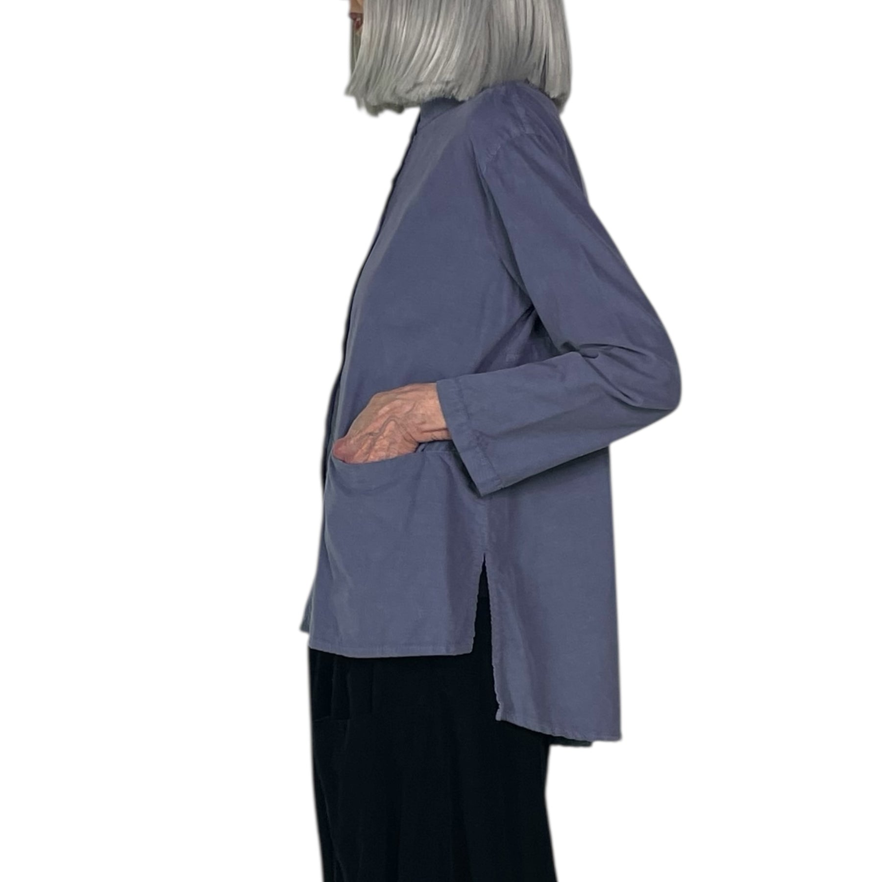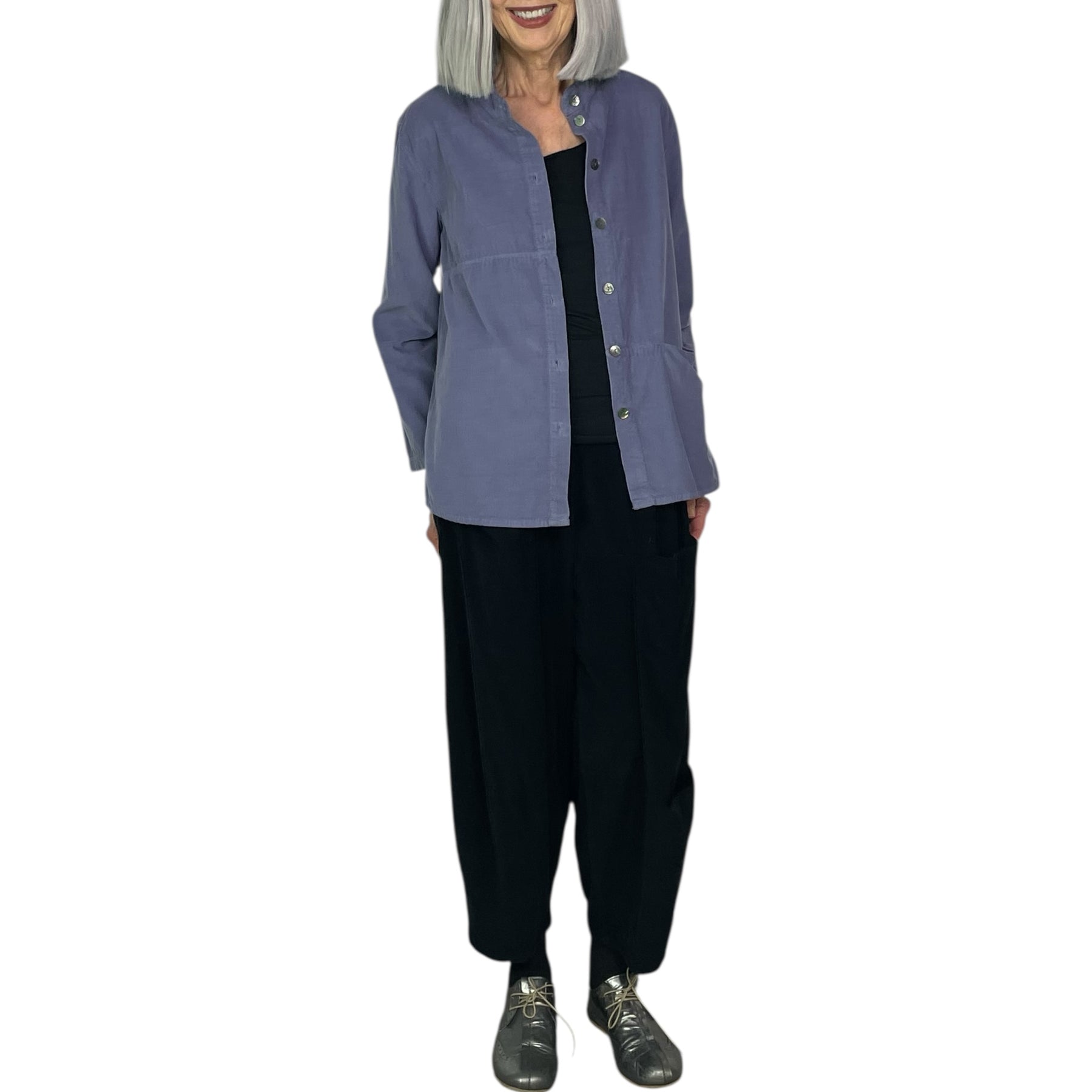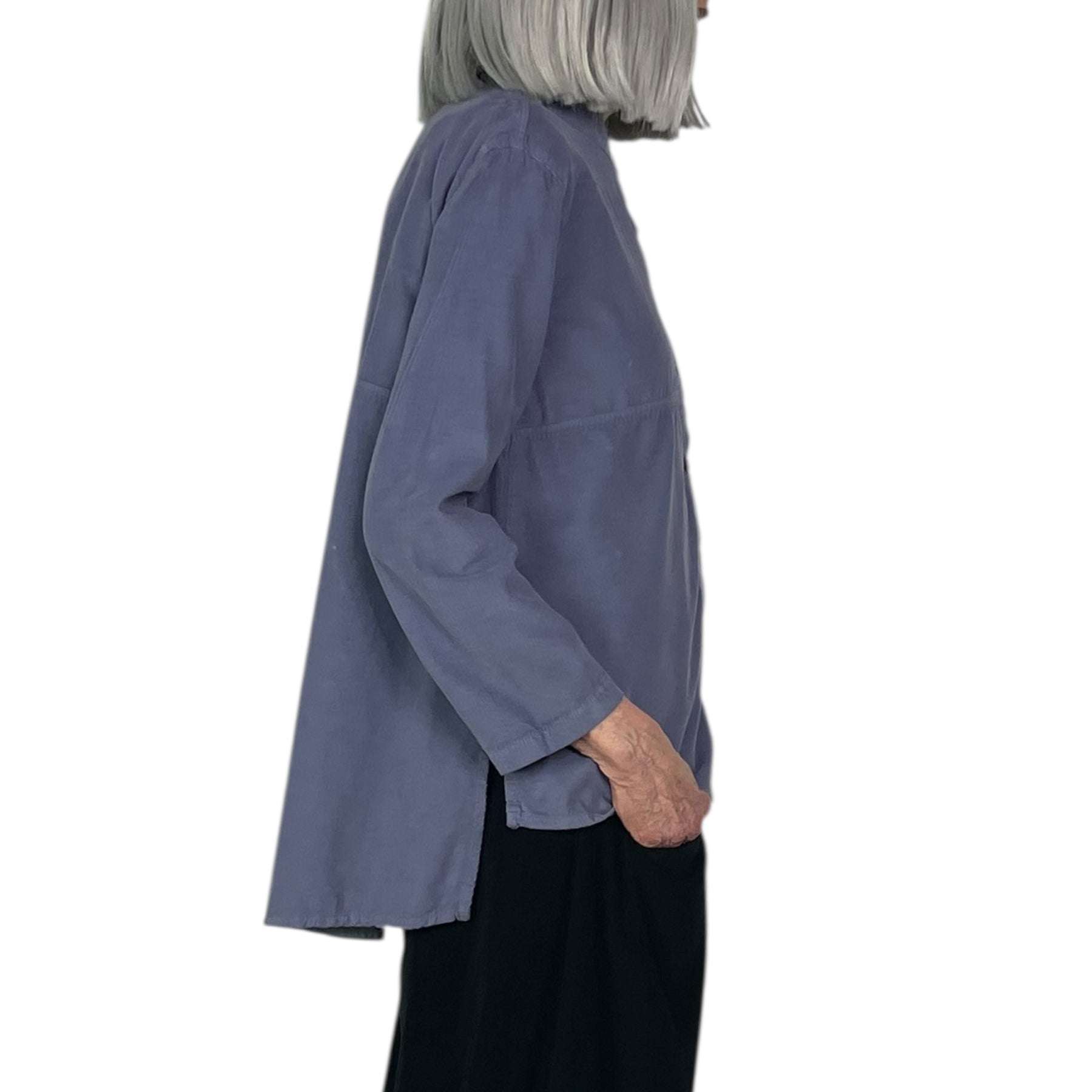 Baby corduroy long sleeve button front shirt. Mandarin collar and drop shoulders.  Single pocket at left hip. Hi-lo back hemline with side slits.