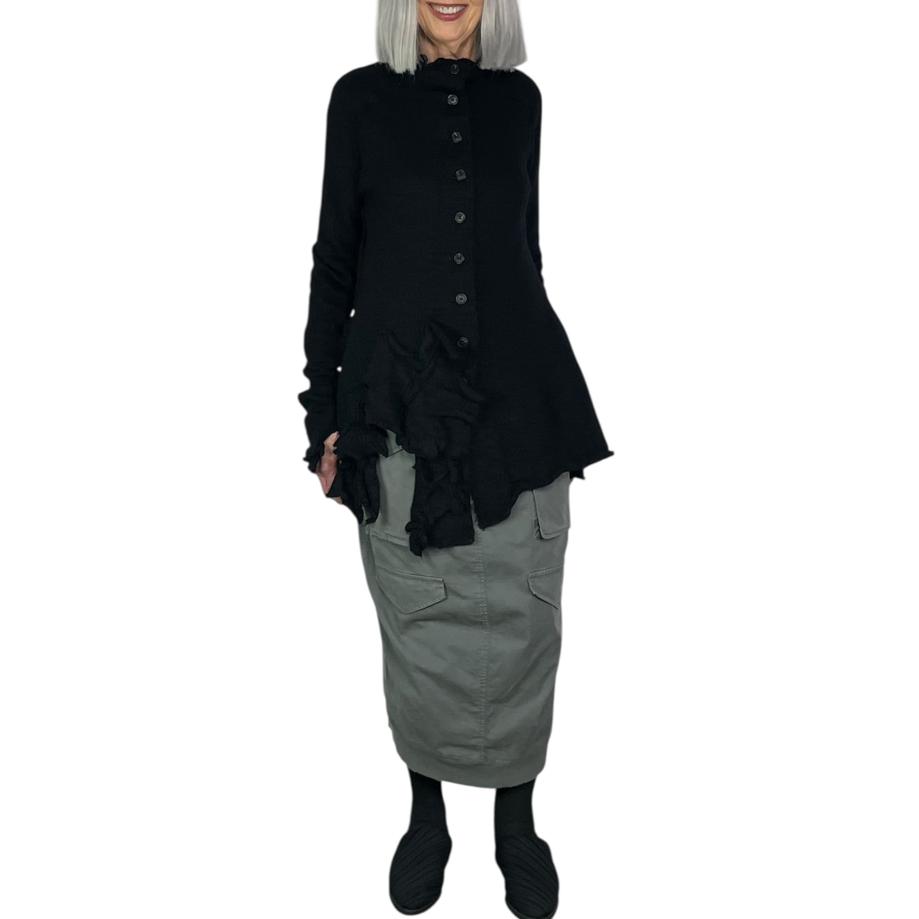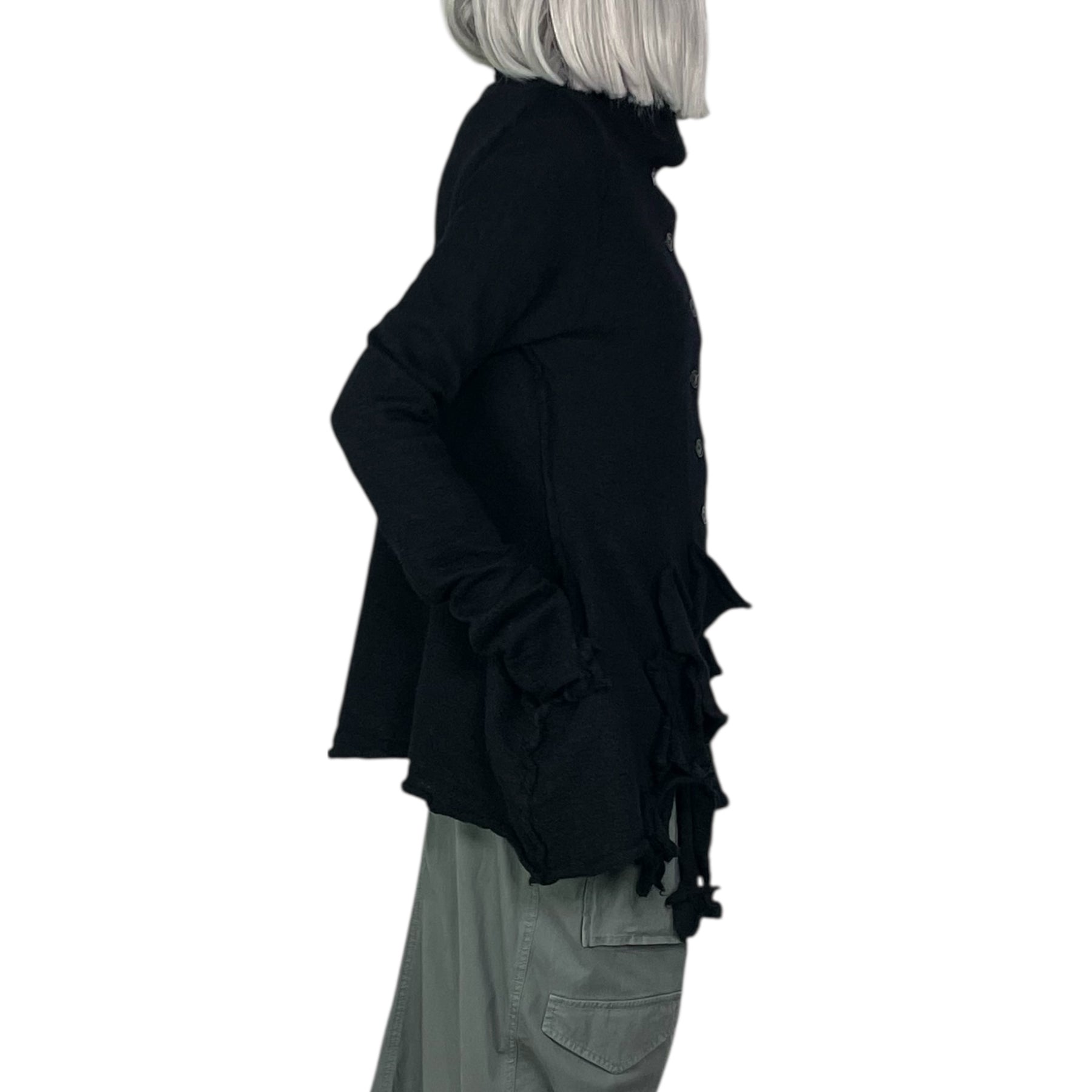 Long sleeve high neck cardigan with button front closure and attached knit 'floral' trim at hip.