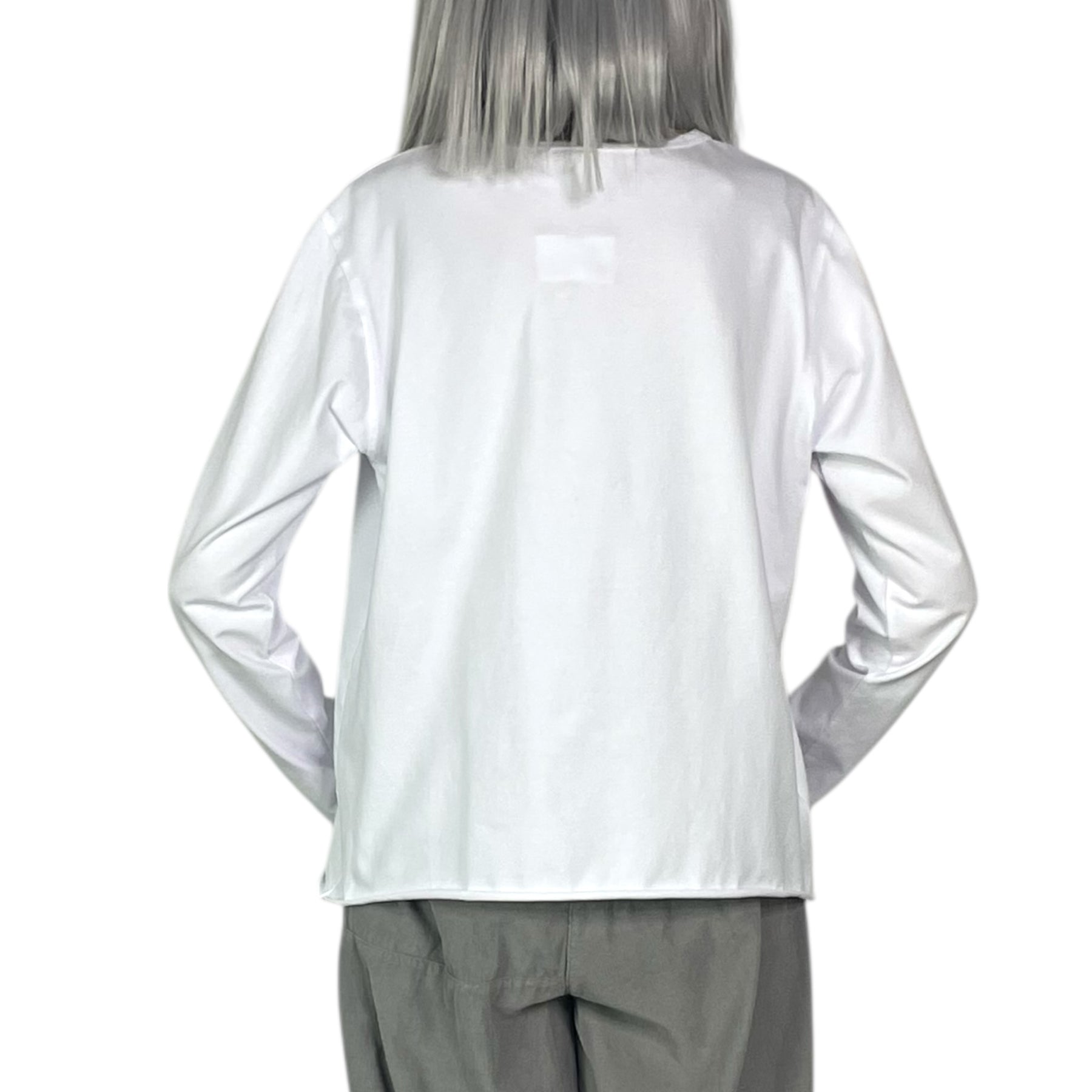 Long sleeve crewneck t-shirt with raw hemline. Heavy weight cotton knit.