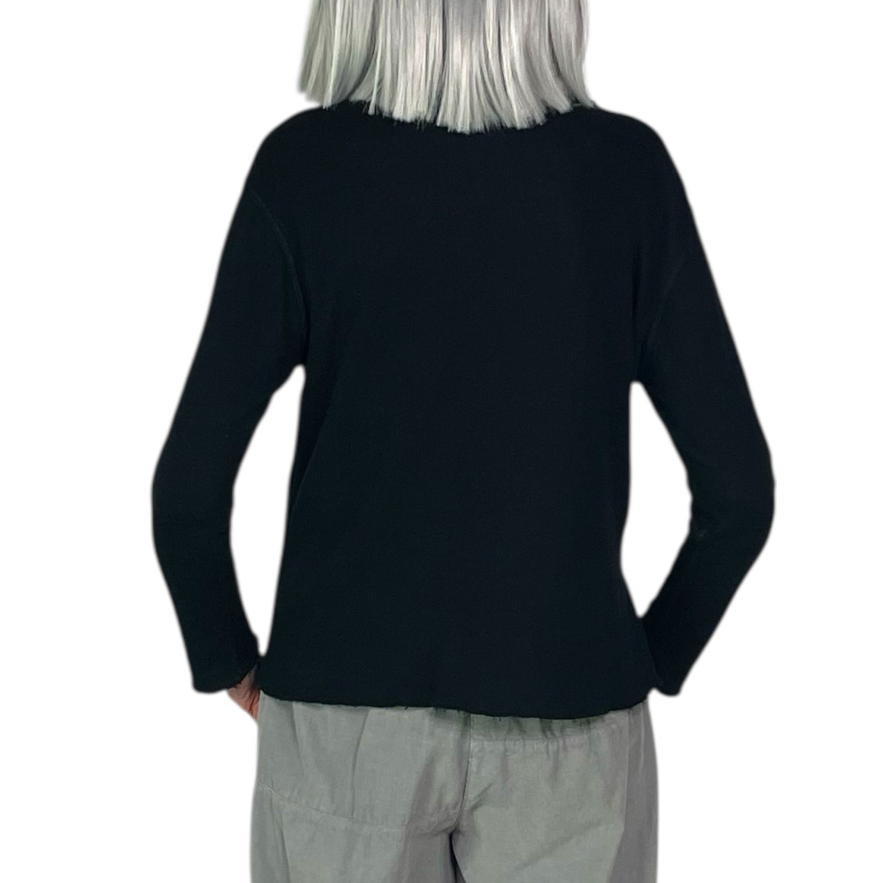 Double layered long sleeve crew-neck t-shirt with drop shoulders. Side slits and raw serged edges.