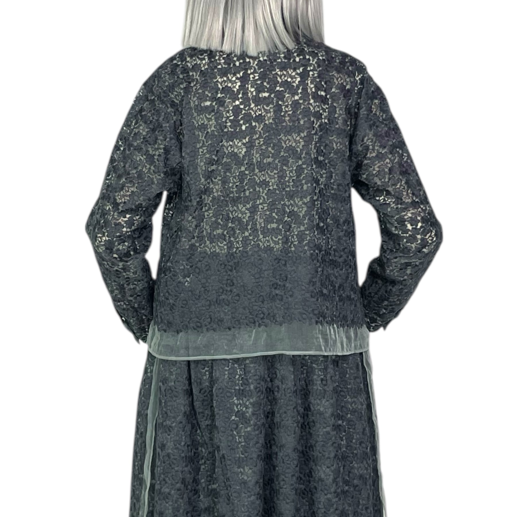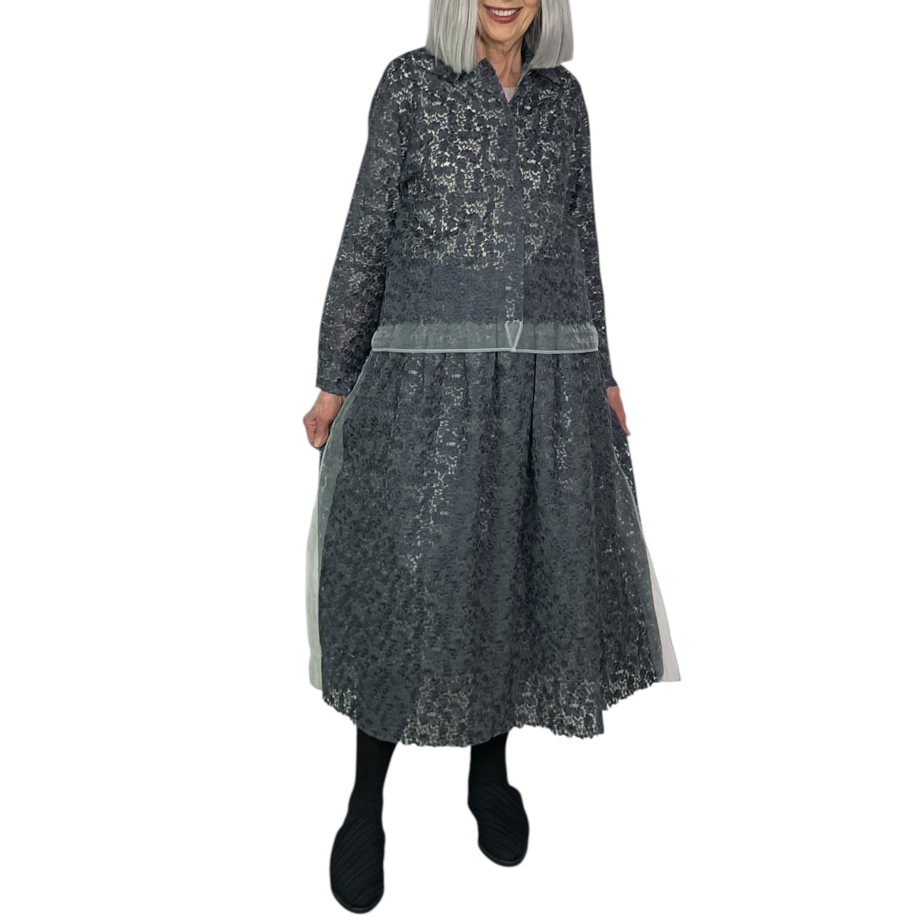Embroidered snap front blouse with extended organza lining at hemline. Long sleeves with button cuffs.