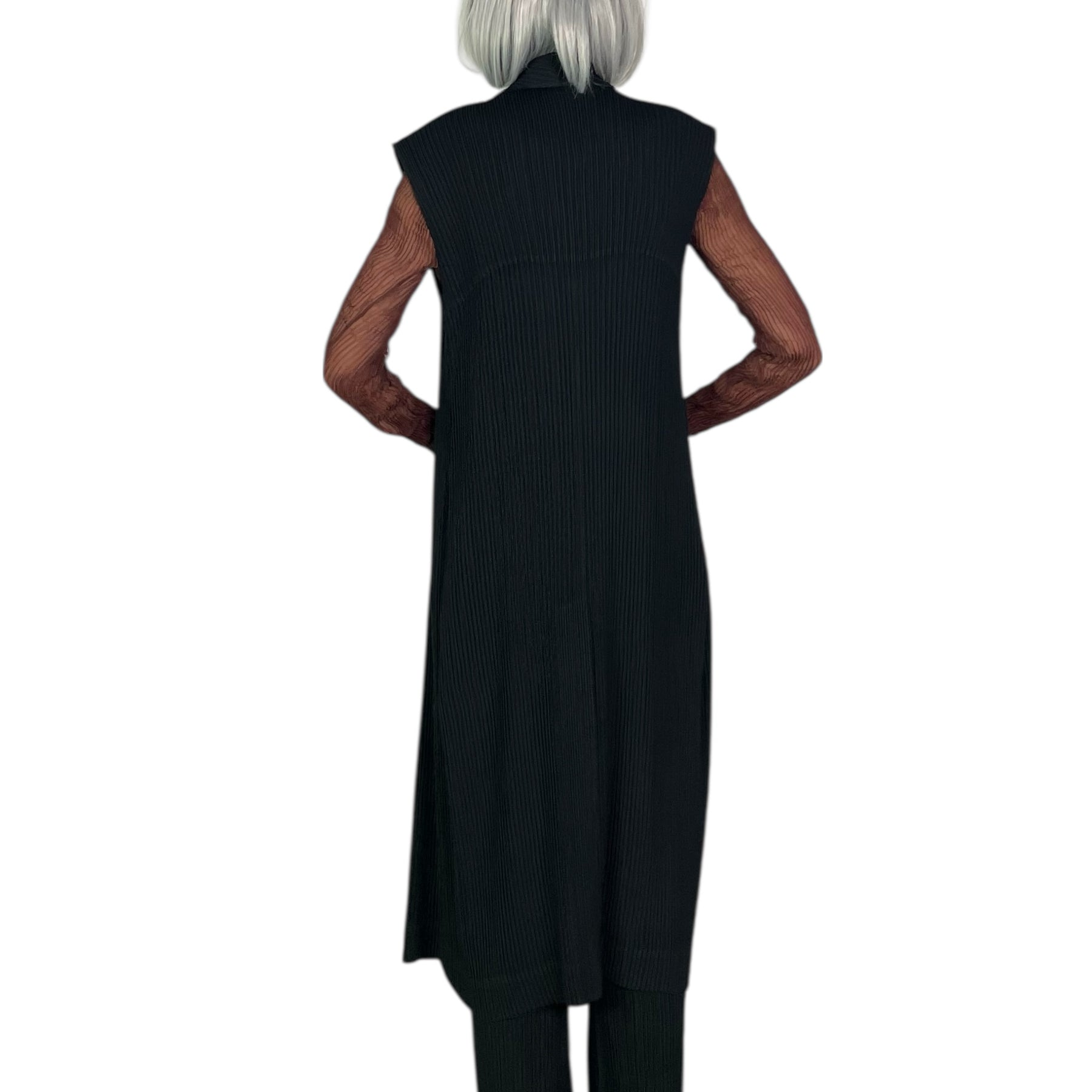 Long vest with a single button front closure, notched collar and two side pockets. High back center vent.