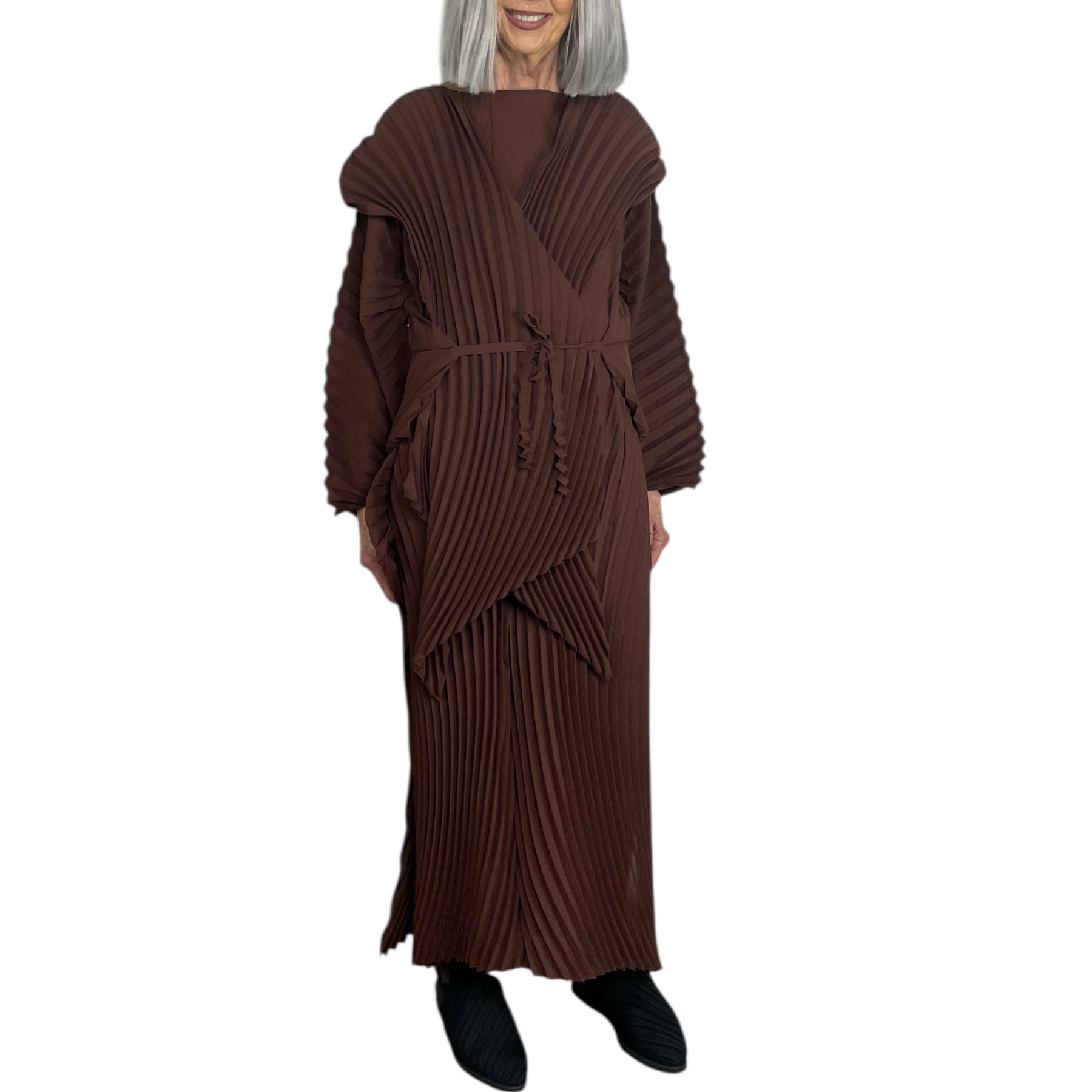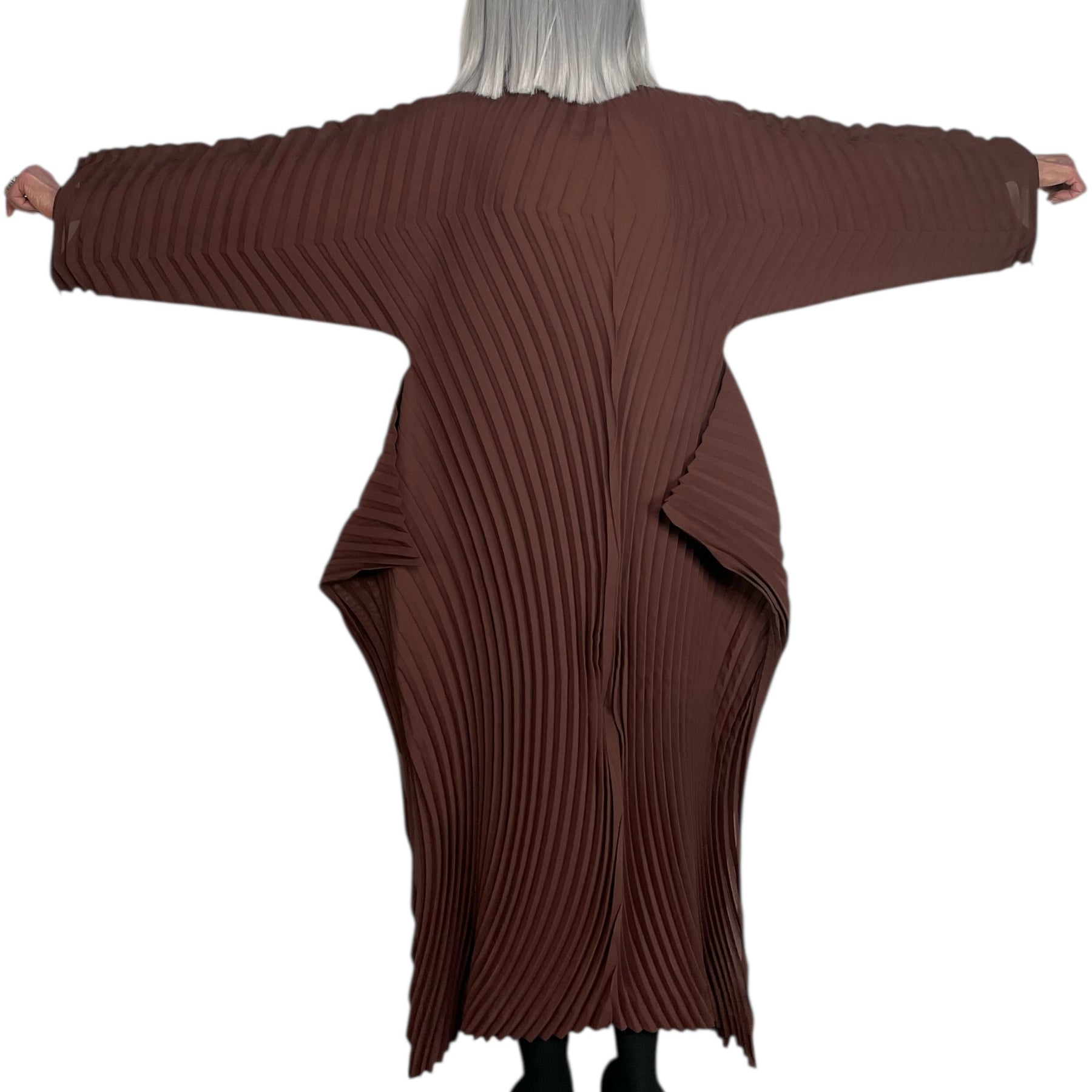 WAVE PLEATS is characterized by its bold, flowing silhouette. Made from tightly twisted polyester with a crisp texture and moderate sheerness for a light feel. Featuring circular handmade pleats, the drape allows it to conform moderately to the body.