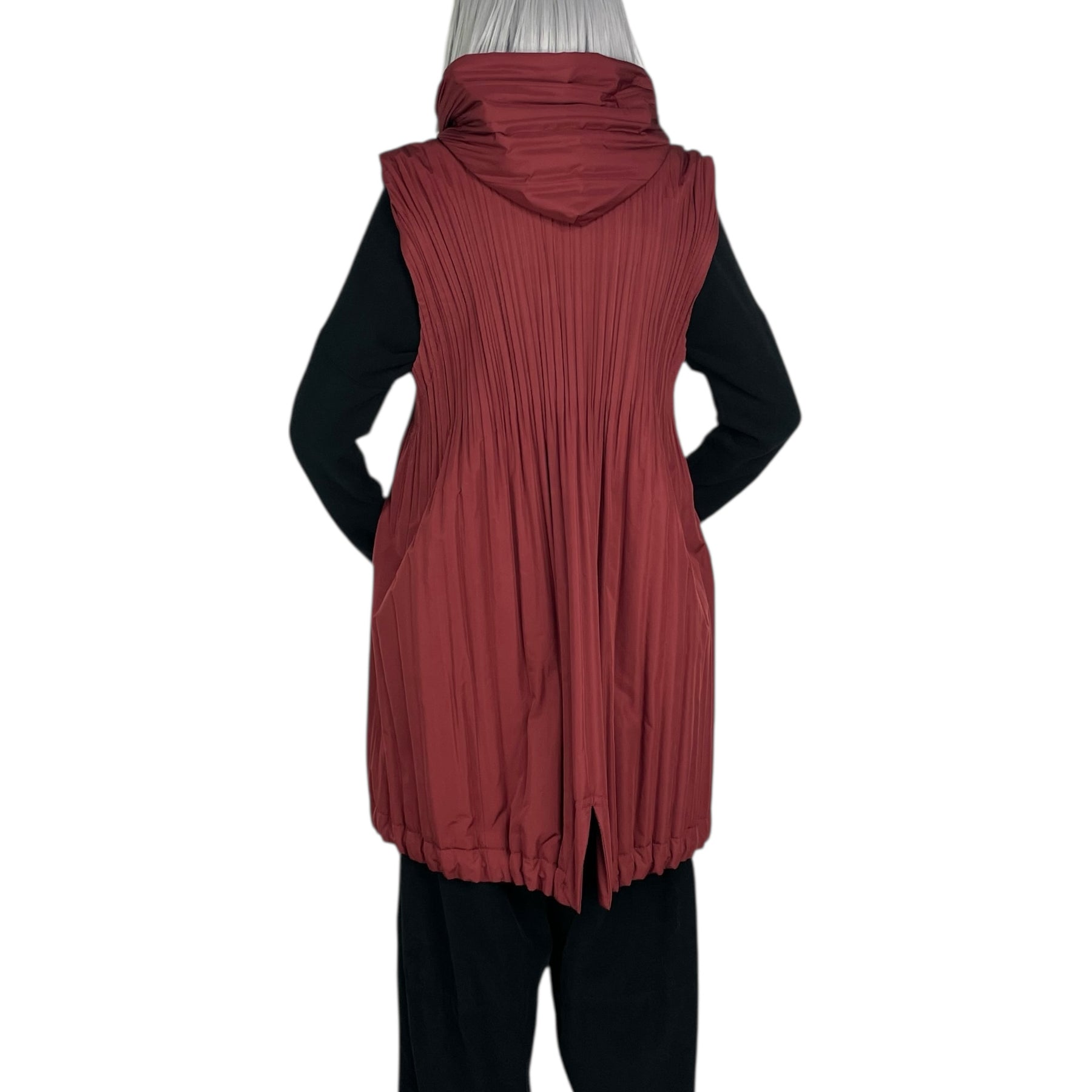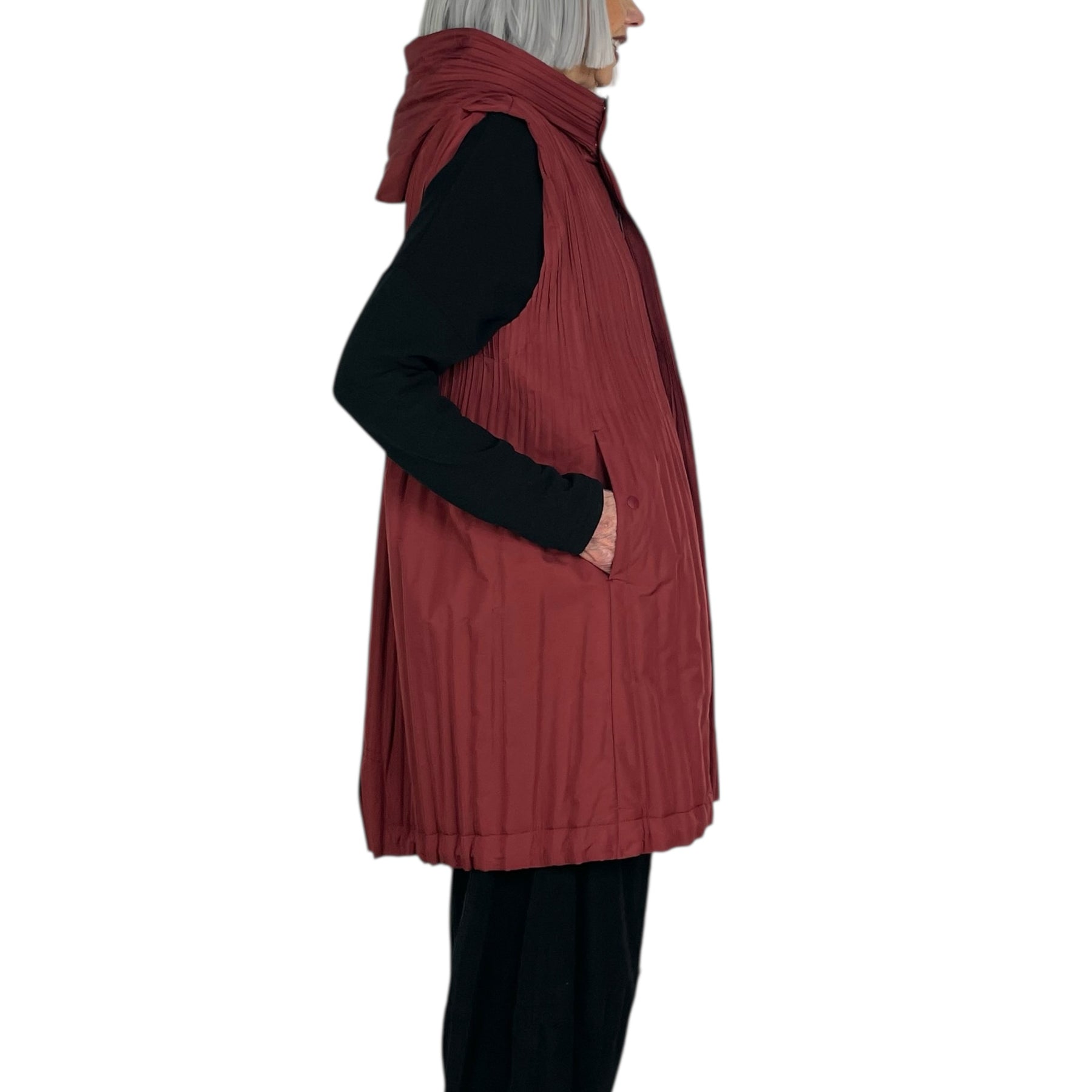 Hooded vest with zip front closure.  Snaps at neckline and hem. Two side pockets with snaps, drawcord at hem.