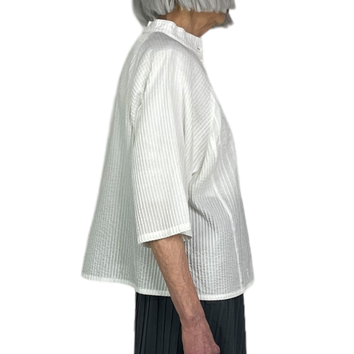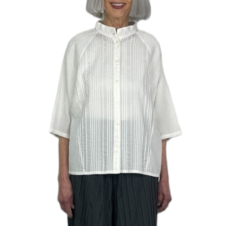 Stand collar button front shirt with 3/4 sleeves, side slits and signature pintuck striping.
