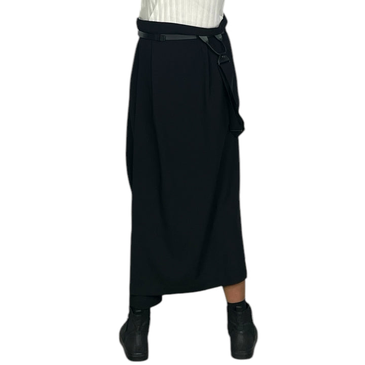 One leg and half skirt panel pants with button fly front, belt loops, and removable single crossbody suspender strap. Two side slit pockets. Fine gauge lightweight wool. Belt not included.