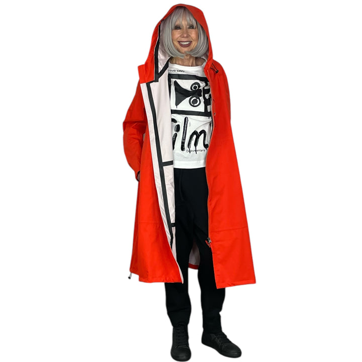 Waterproof hooded coat with 2-way zip front closure and two sides pockets. Draw cord adjustments at hood, cuff and hemline. Zippered accent breast and arm pockets. Oversized grid pattern lining.