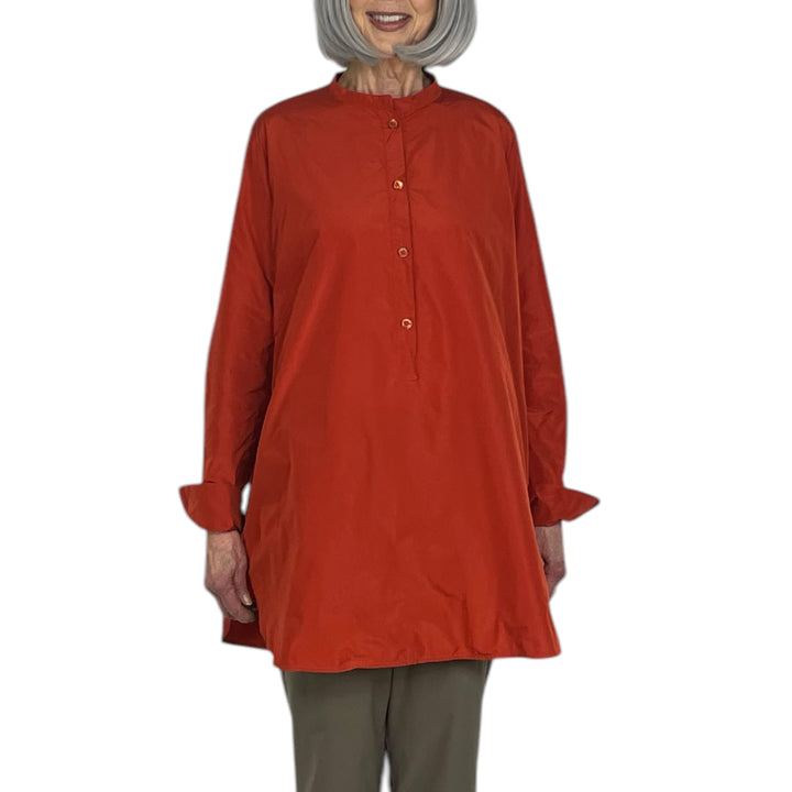 Long sleeve mandarin collar shirt with button front half placket and two side pockets. Button barrel cuffs, shirt tail hemline, and A-line silhouette.