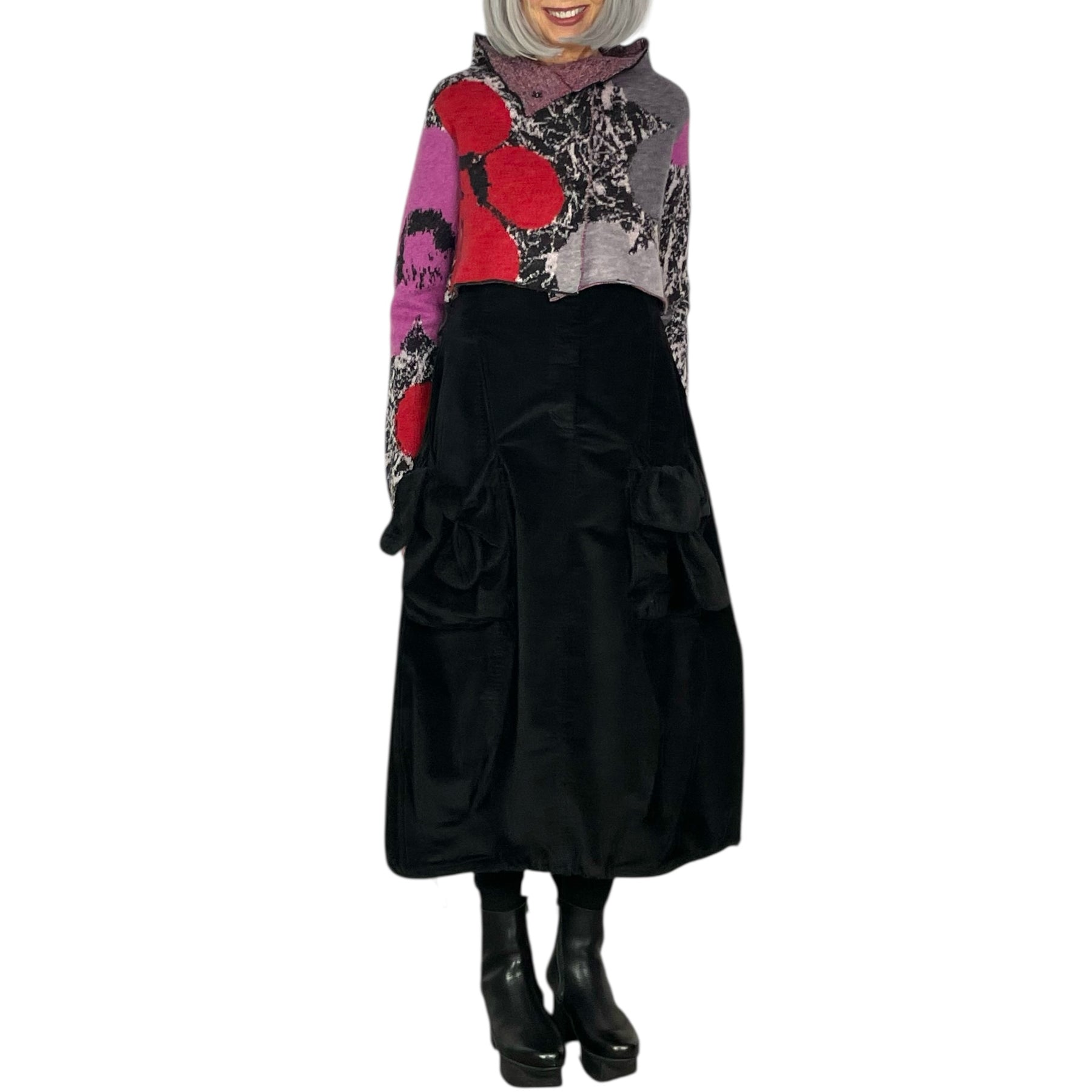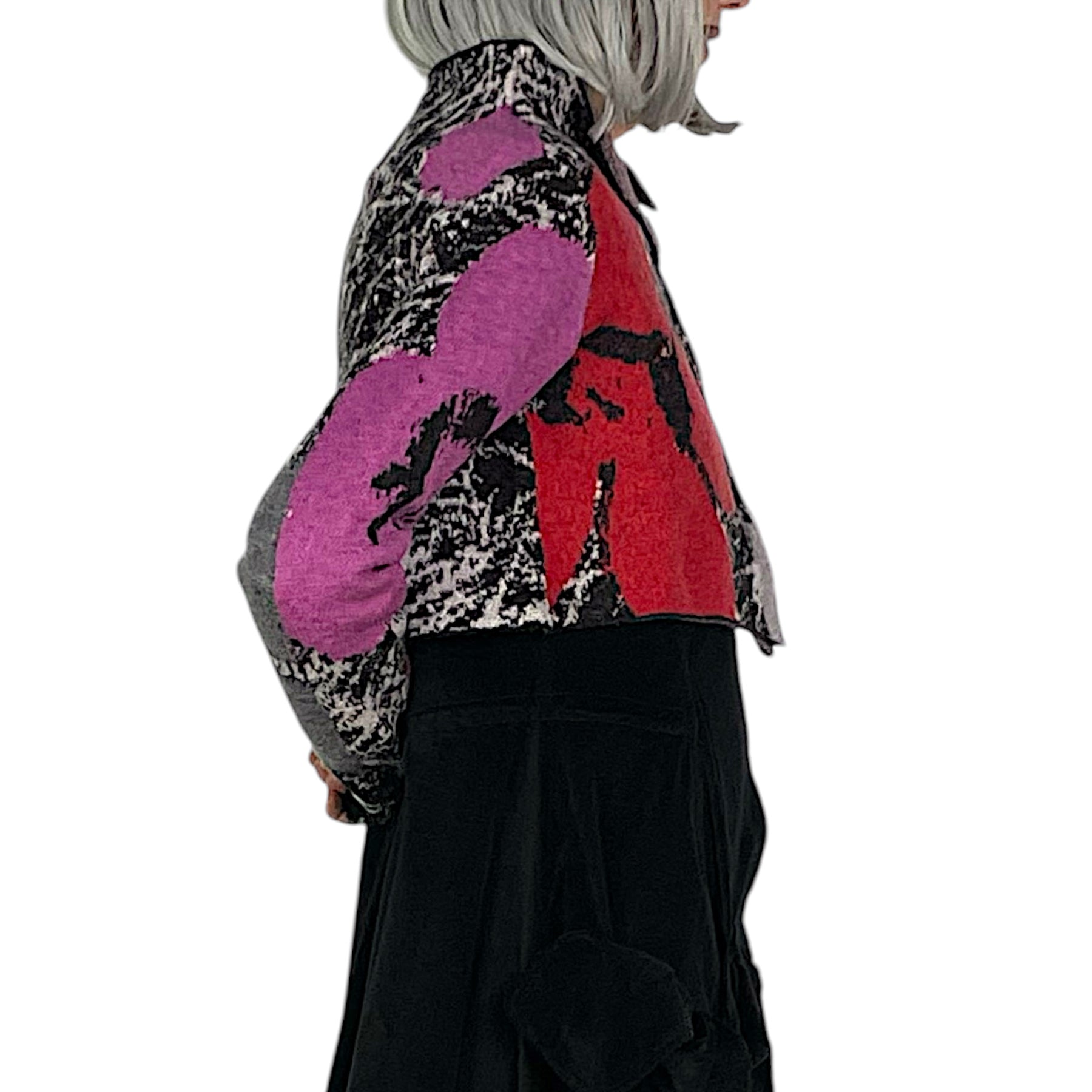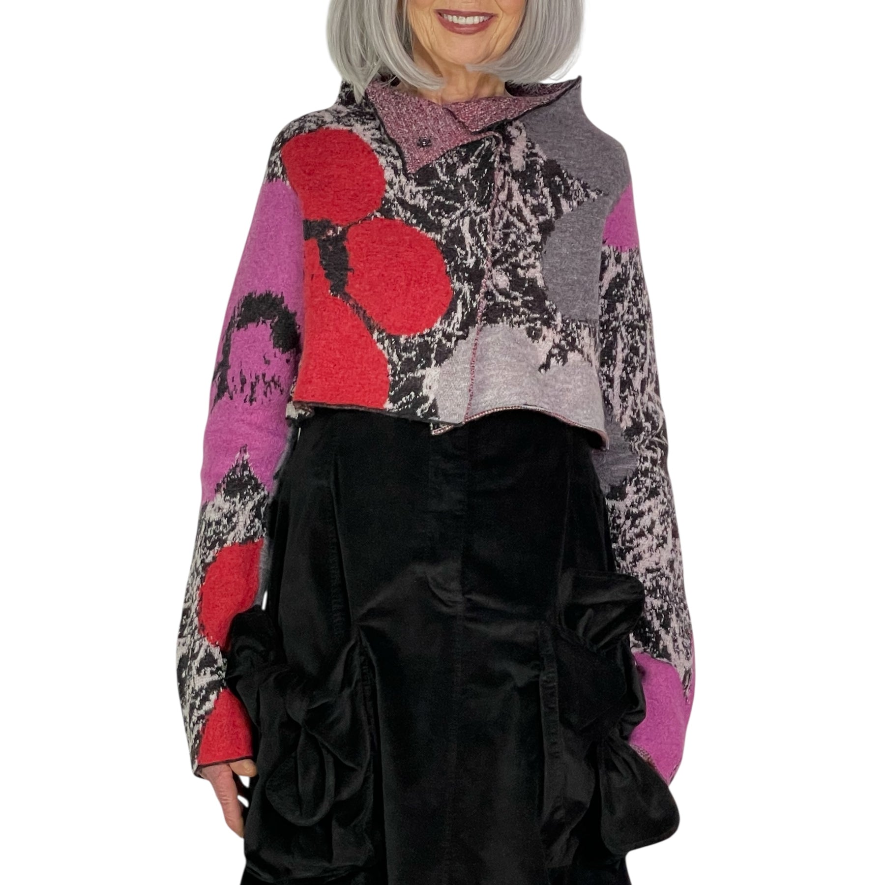 Long sleeve floral intarsia knit cardigan with a high neckline and snap front closure. Cropped length.