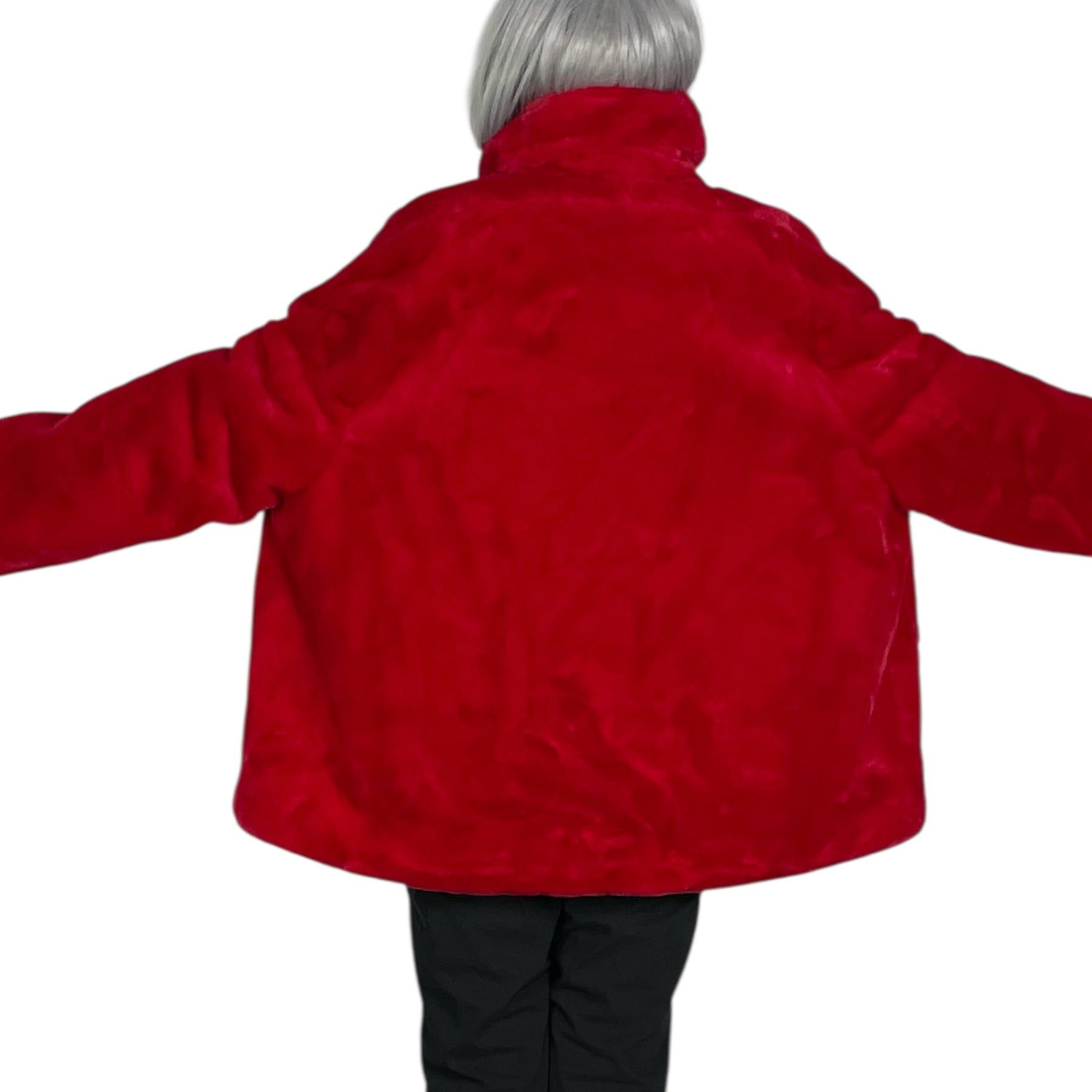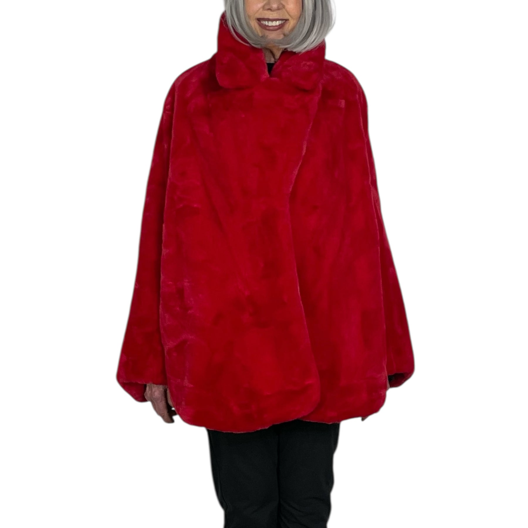 Long sleeve soft faux fur notch collar jacket with clip-snap front closure. Two side pockets, generous fit.