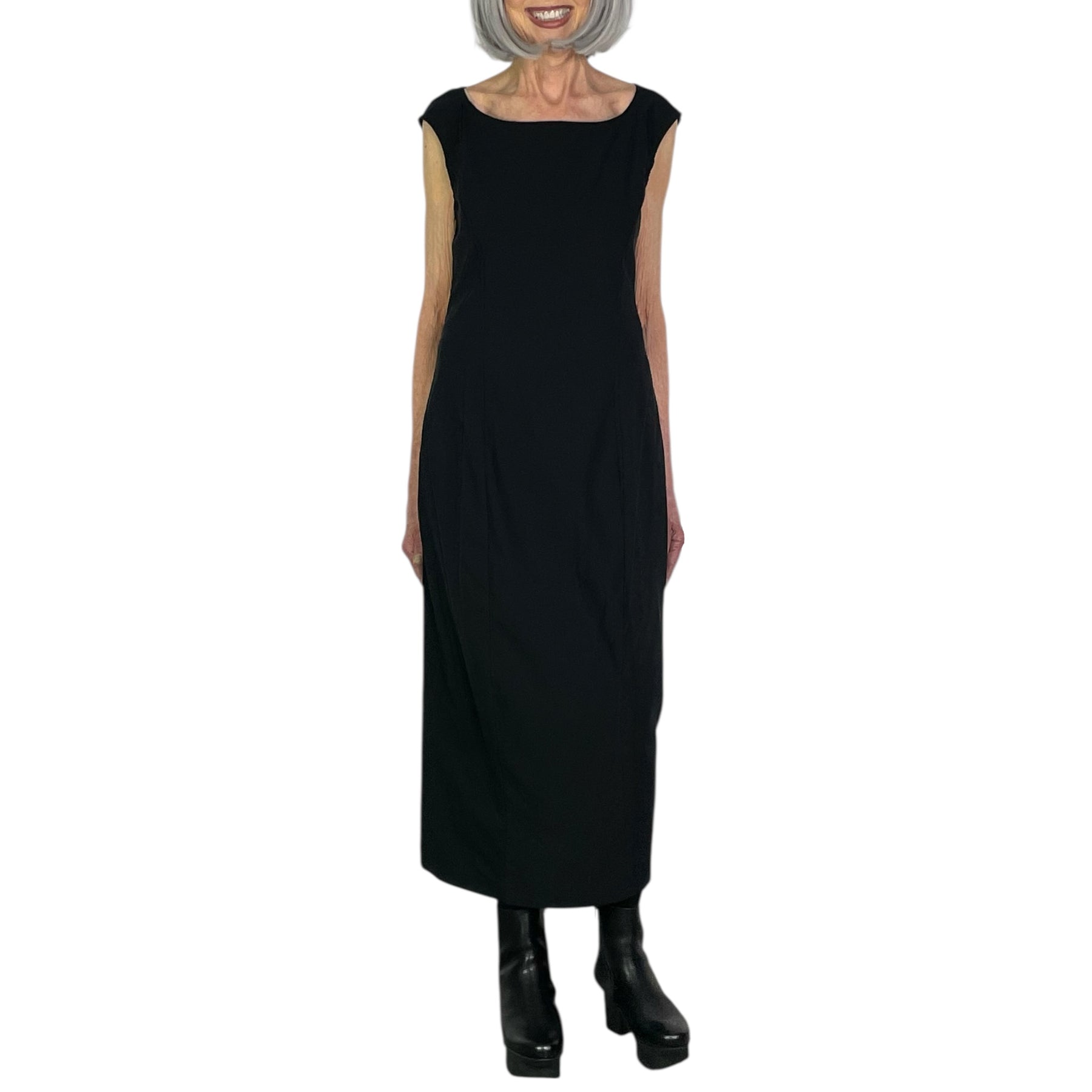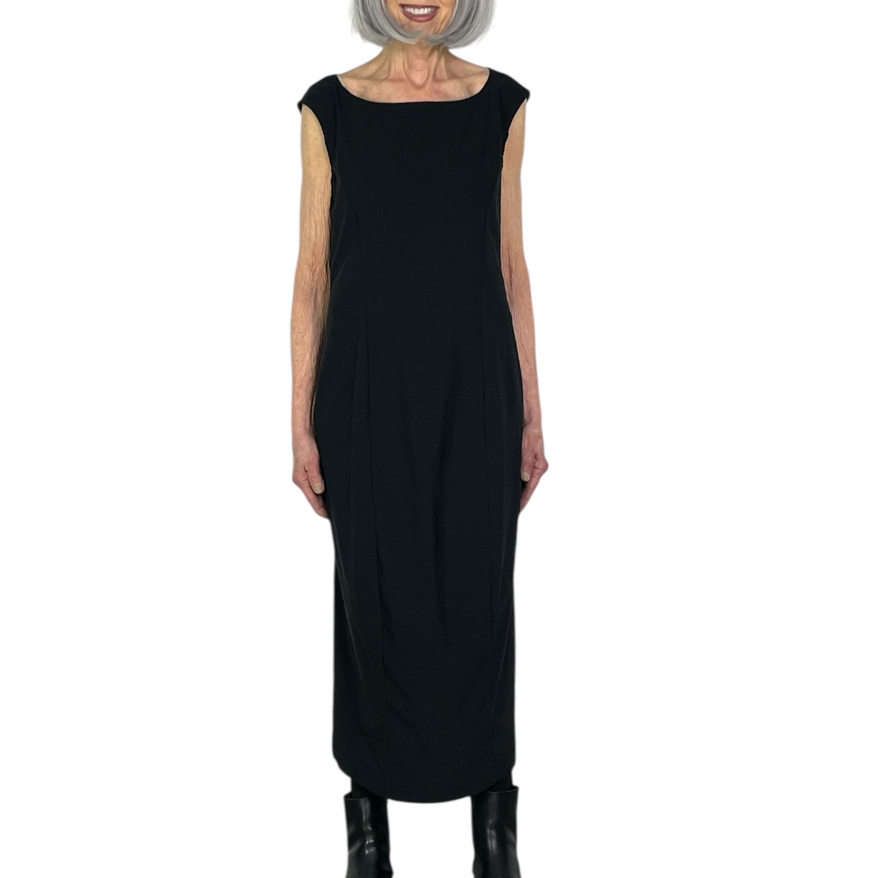 Sleeveless seamed slim dress with a wide round neckline back side vent.