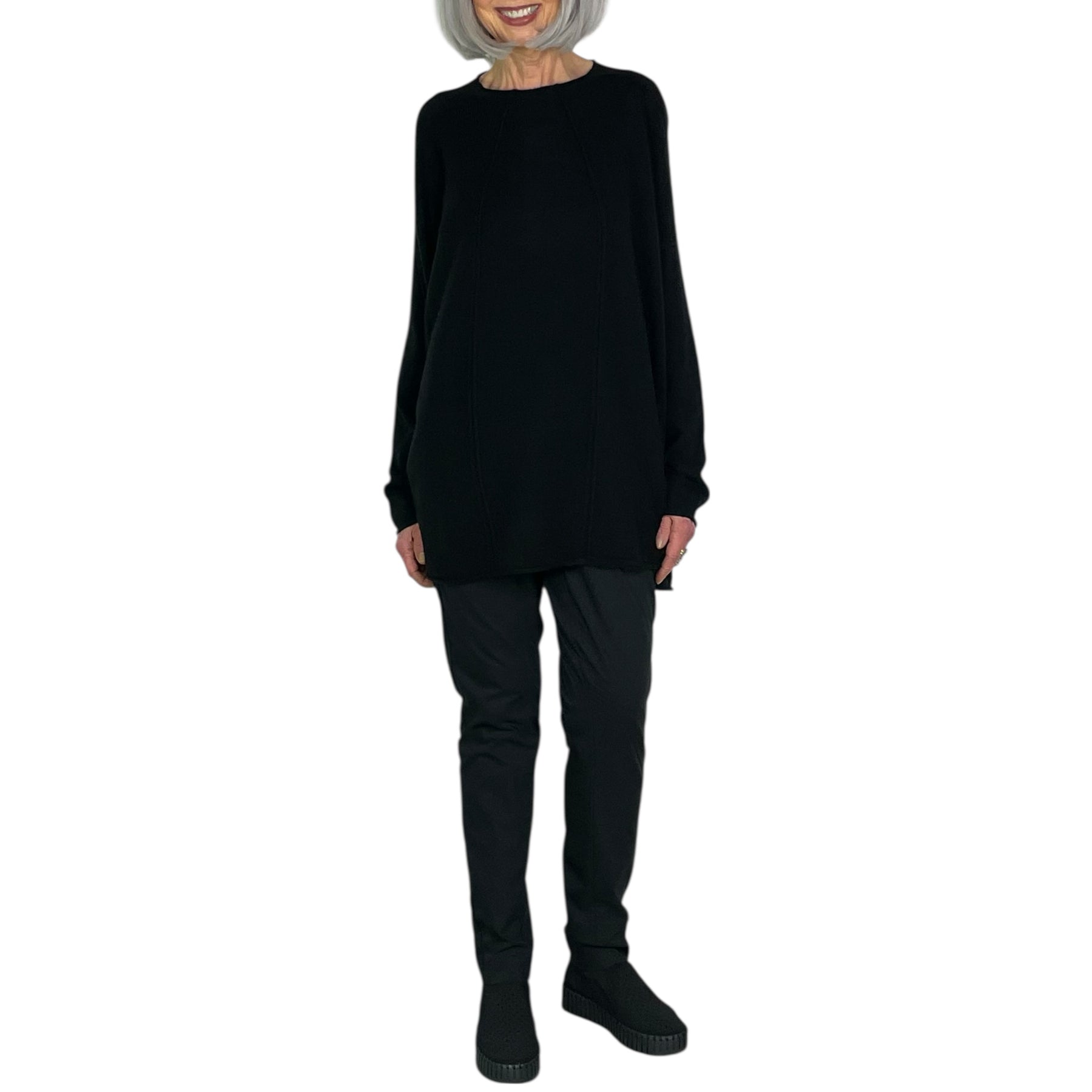 Long sleeve knit pullover sweater with seaming detail.  Raglan sleeves, rolled edges throughout.  Single ribbed panel on front right side.  Generous fit.