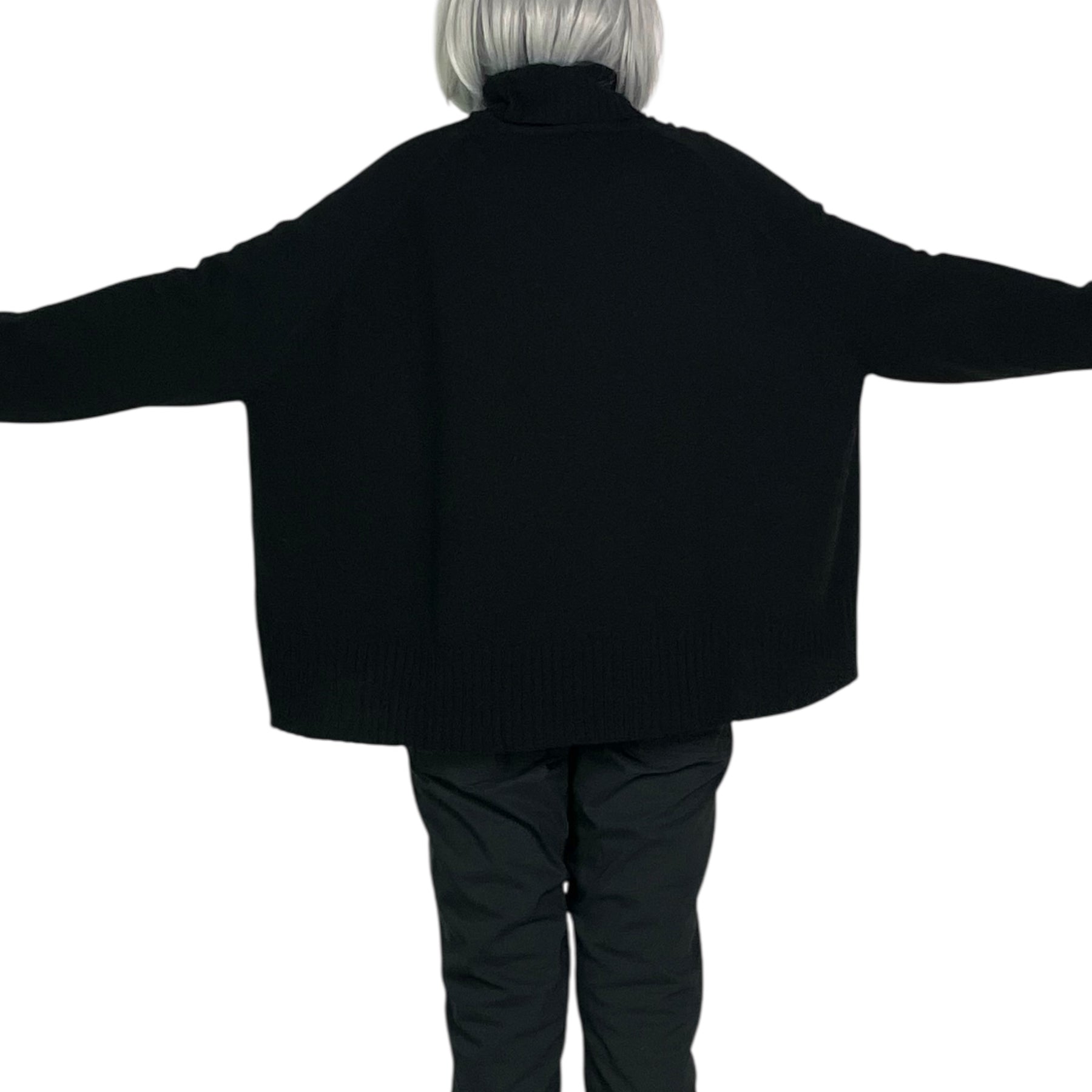Long sleeve knit sweater with a relaxed turtleneck and raglan sleeves.  Wide ribbing at neck and hi-lo hemline, raw edges at cuffs.  Wide silhouette, generous fit.