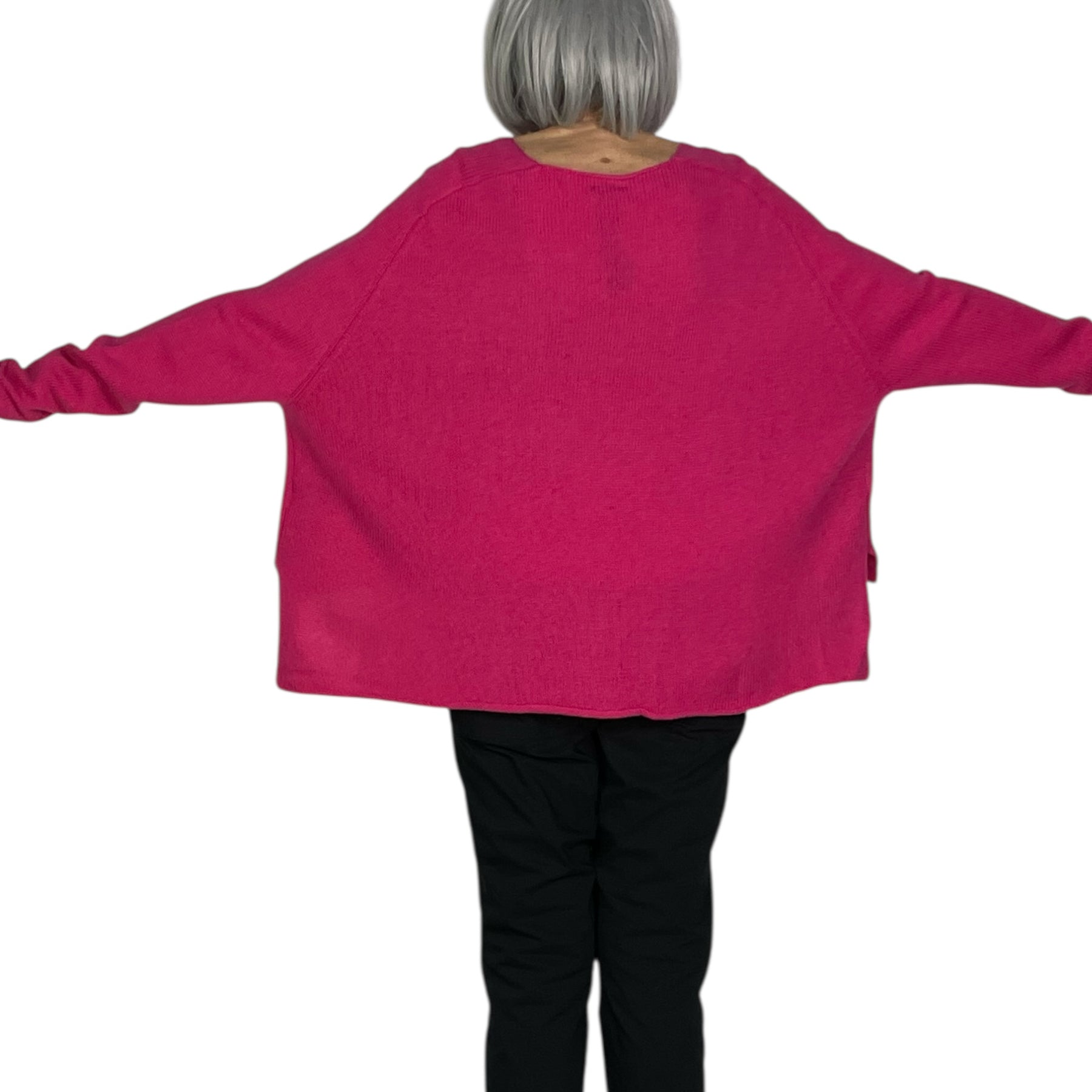 Cropped A-line knit pullover sweater with a crew neckline and hi-lo hem.  Raglan sleeves, side slits, rolled edges throughout.  Generous fit.