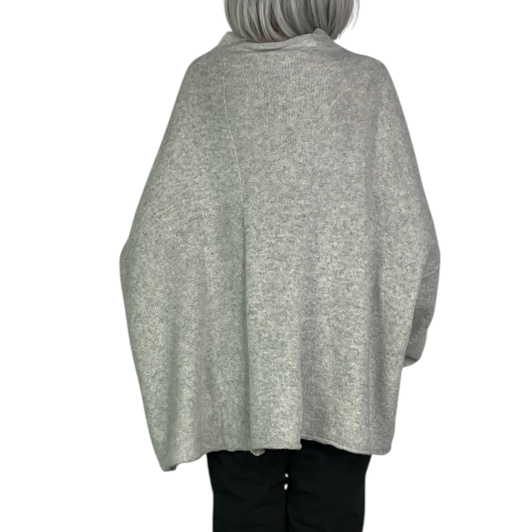 Long sleeve multi-directional knit sweater with a funnel neckline.  Drop shoulders, rolled edges throughout.  Wide, oversized fit.