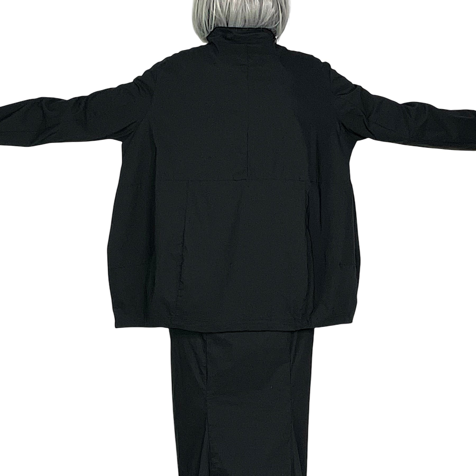 Long sleeve button front jacket with a high neckline. Two front pockets within a ribbed round cutout detail. Curved shaped silhouette at back.