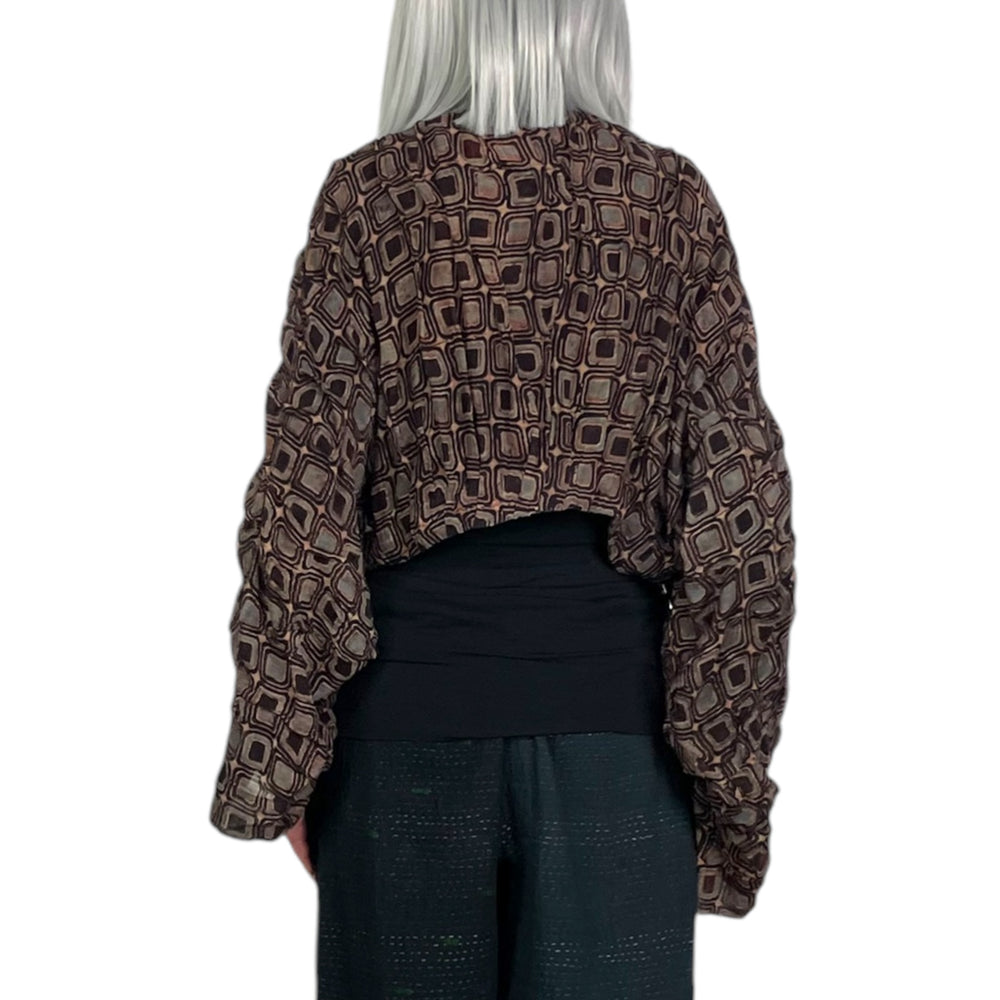 Ajarakh square print long sleeve shirt jacket with a round neckline and snap front closure. Wavy tucked, vegetable dyed cotton fabric. Cropped with a boxy silhouette and a relaxed fit.