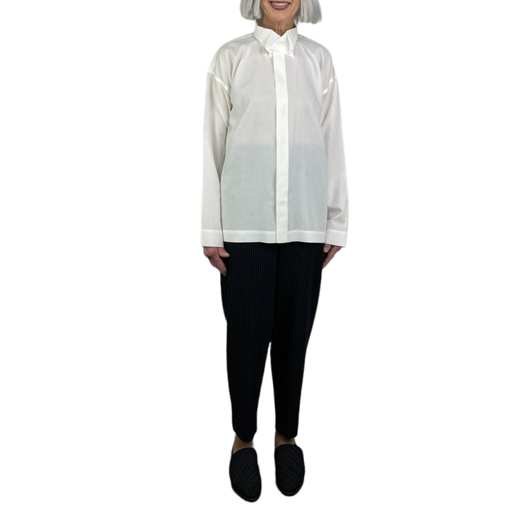 Unisex long sleeve shirt with button front placket and bow-tie pleated collar. Drop shoulder, straight hemline, and slits at plain cuff and sides.