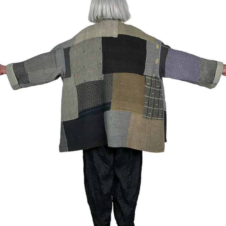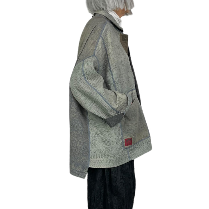 Reversible snap front A-line coat with a shirt collar and long sleeves. On seam front pockets, patch pockets on reverse. 4-layer vintage saris fabric with hand-stitching throughout. Oversized fit.
