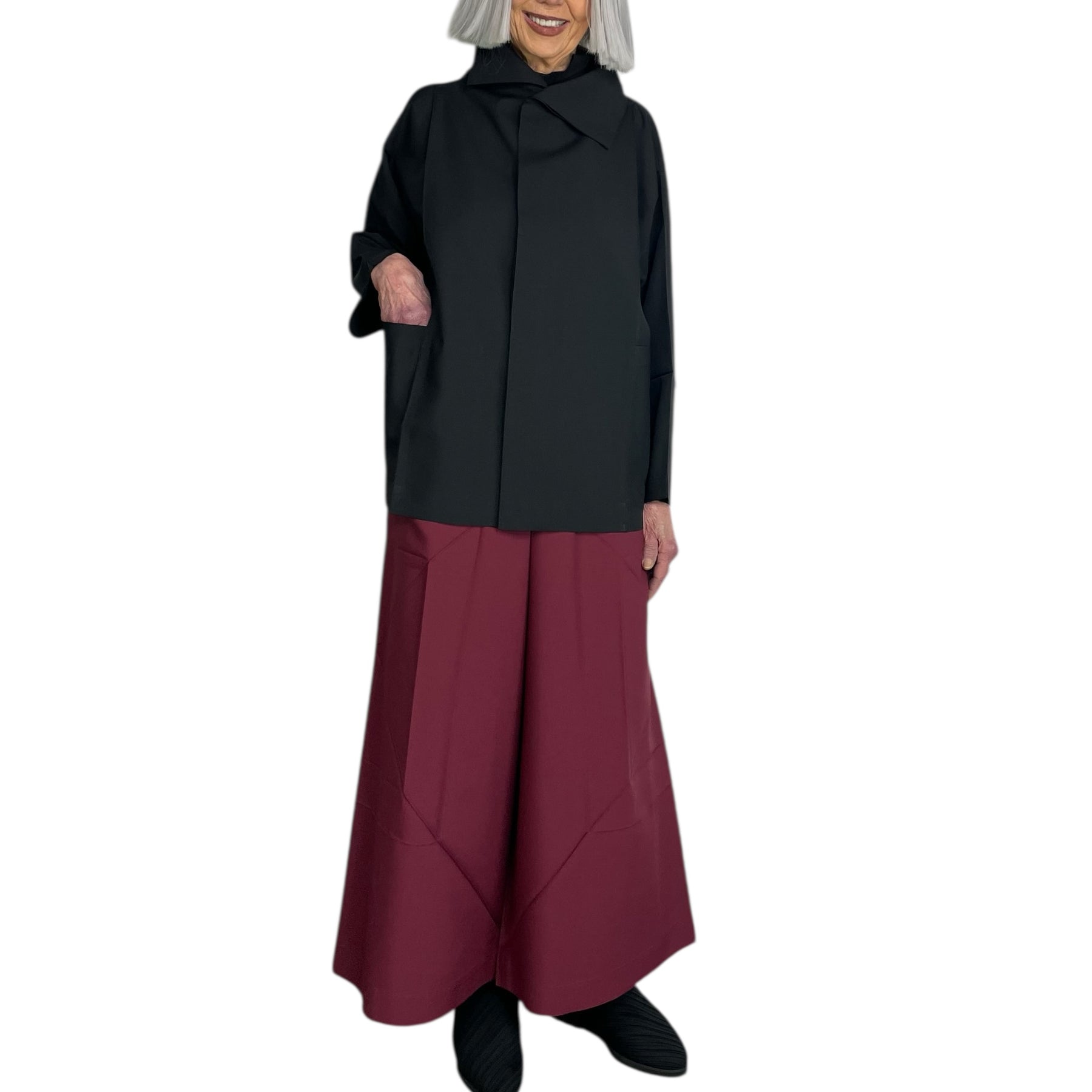 Fold-pleated long sleeve jacket with two front pockets and button front closure.