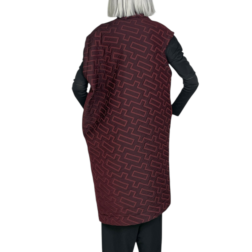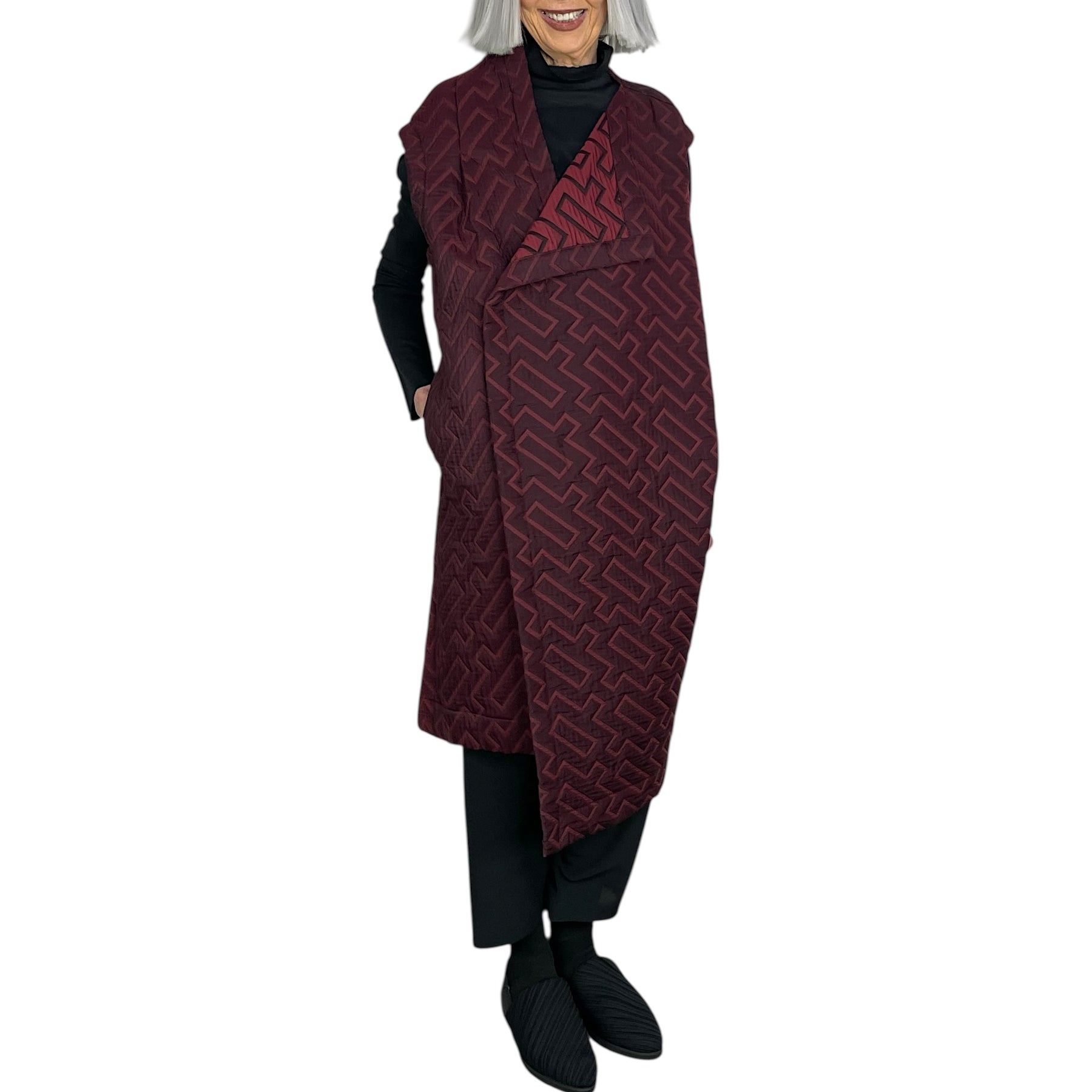 Jacquard long vest with off-center 2-button front closure.  Turn-down collar designed to show the color contrast between the front and reverse.  Two side pockets, asymmetric hemline.