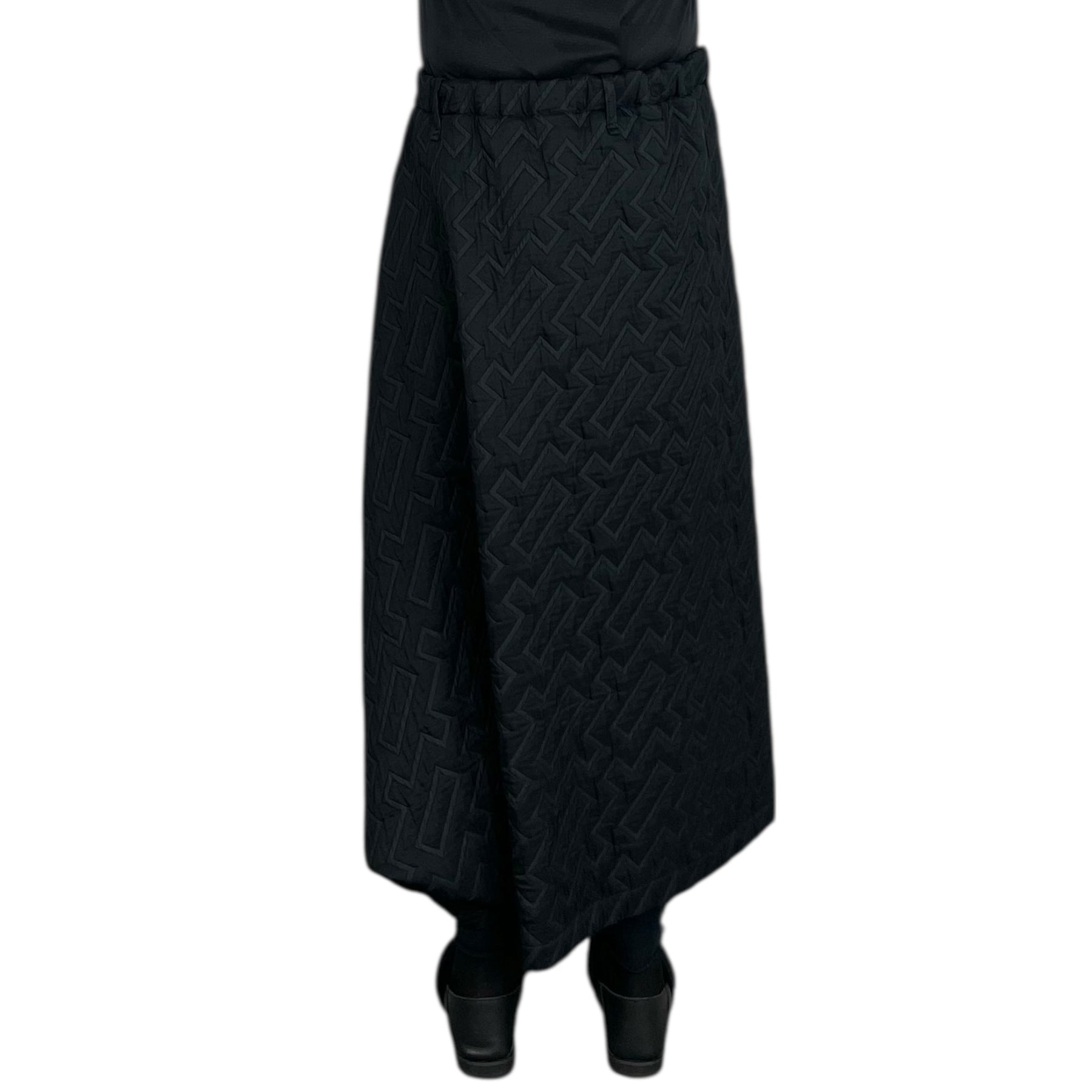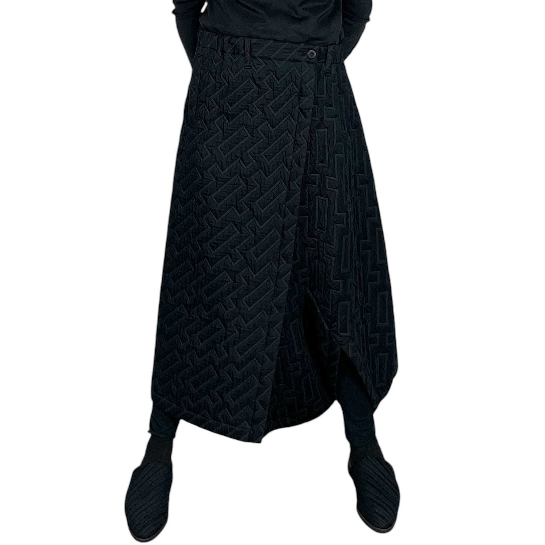 Jacquard pant with a skirt-like panel and asymmetric hems. Two side pockets, off-center button front with elastic waistband and belt loops.