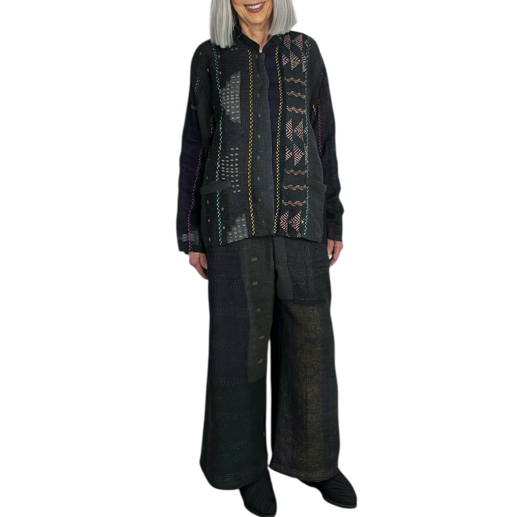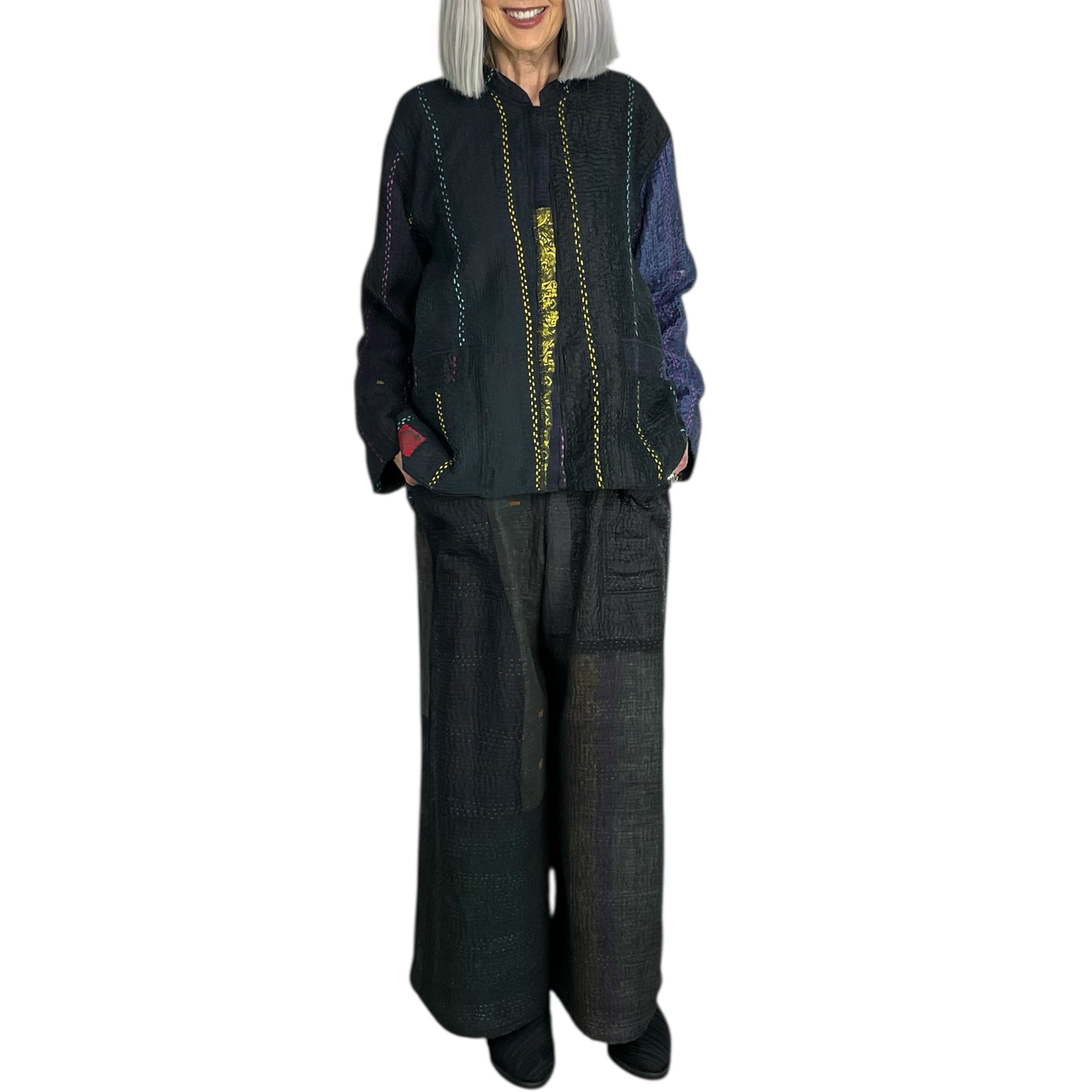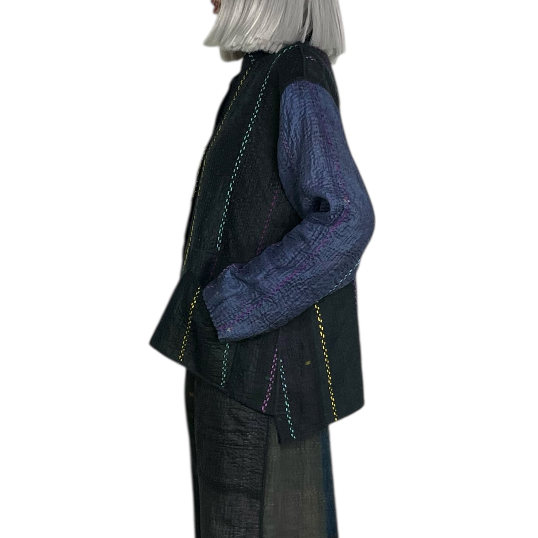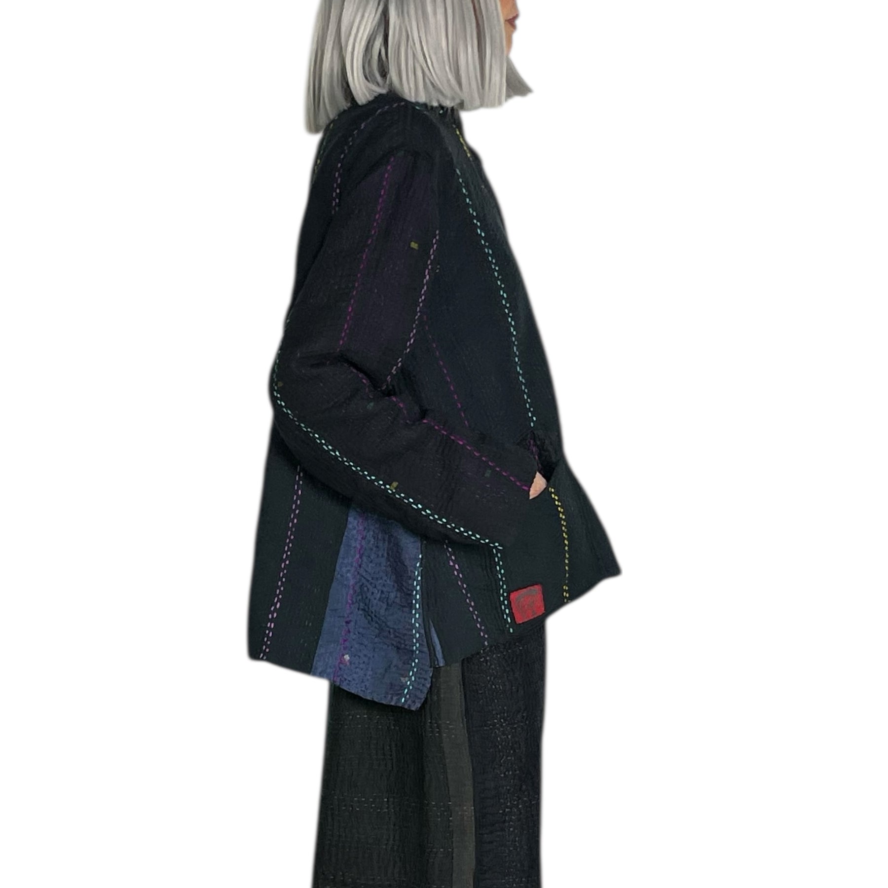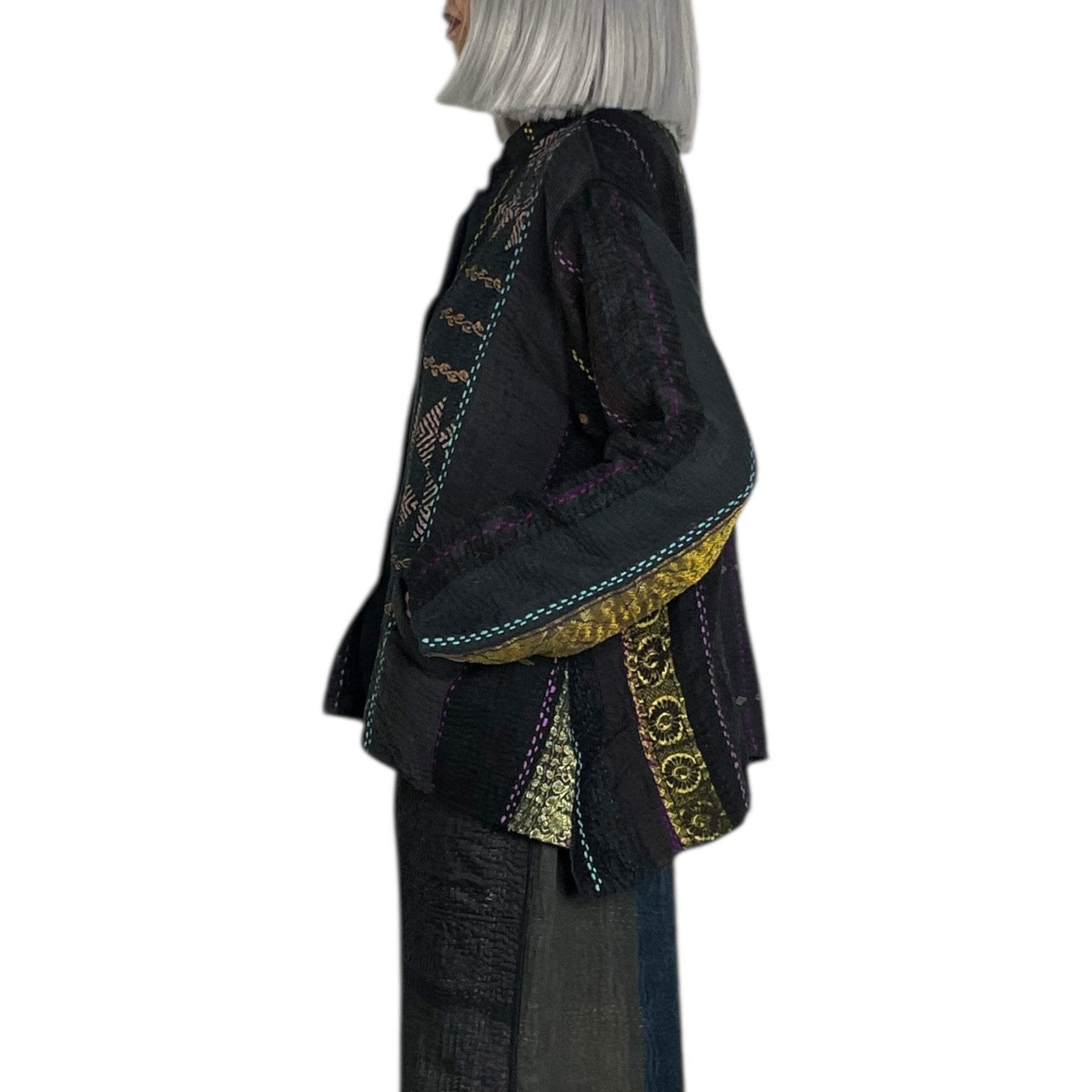 Reversible long sleeve vintage kantha jacket with a stand collar and snap front closure. Welt pockets on front side, patch pockets on reverse. Medium weight, jewel woven with vertical patches. 4-layer vintage saris with hand-stitching throughout. Relaxed fit, boxy silhouette. Hip length.