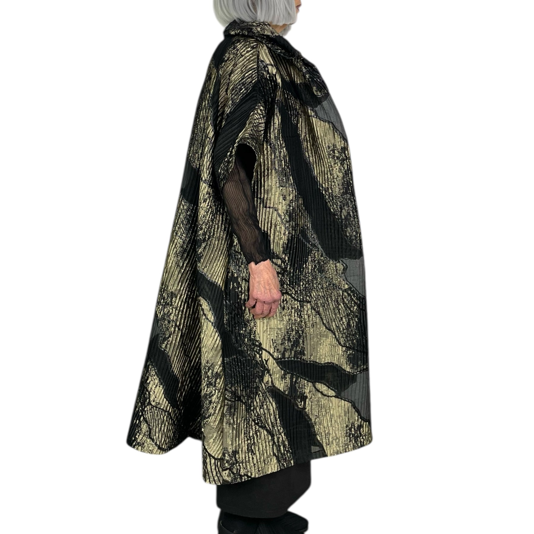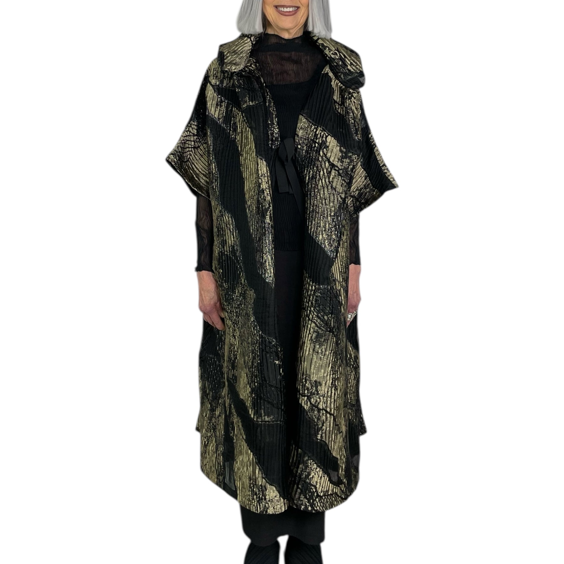 Short sleeve kimono coat with tie closure. Metallic brocade and sheer fabric. Generous fit.