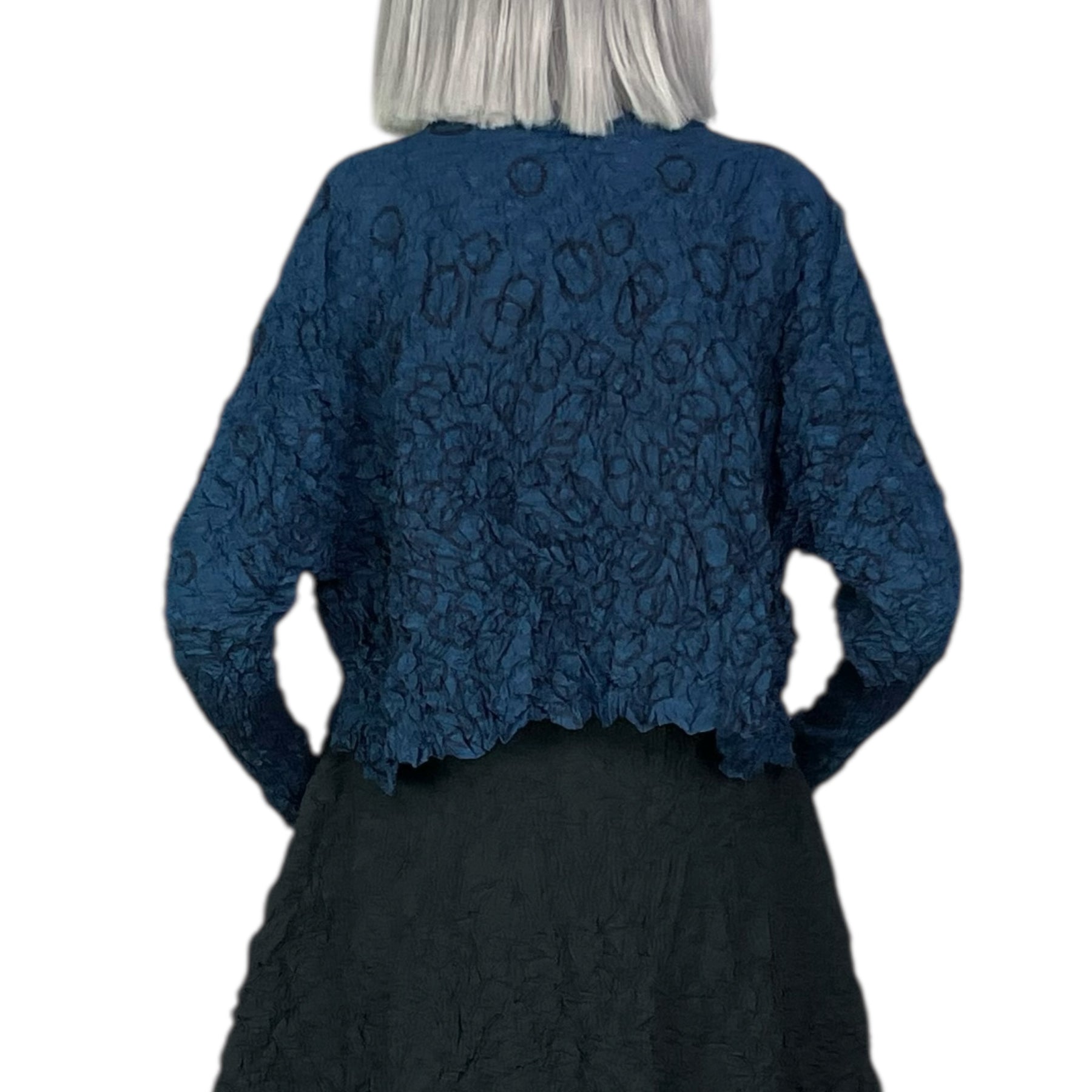Shibori crush pleated crop top with long sleeves and a round neckline.