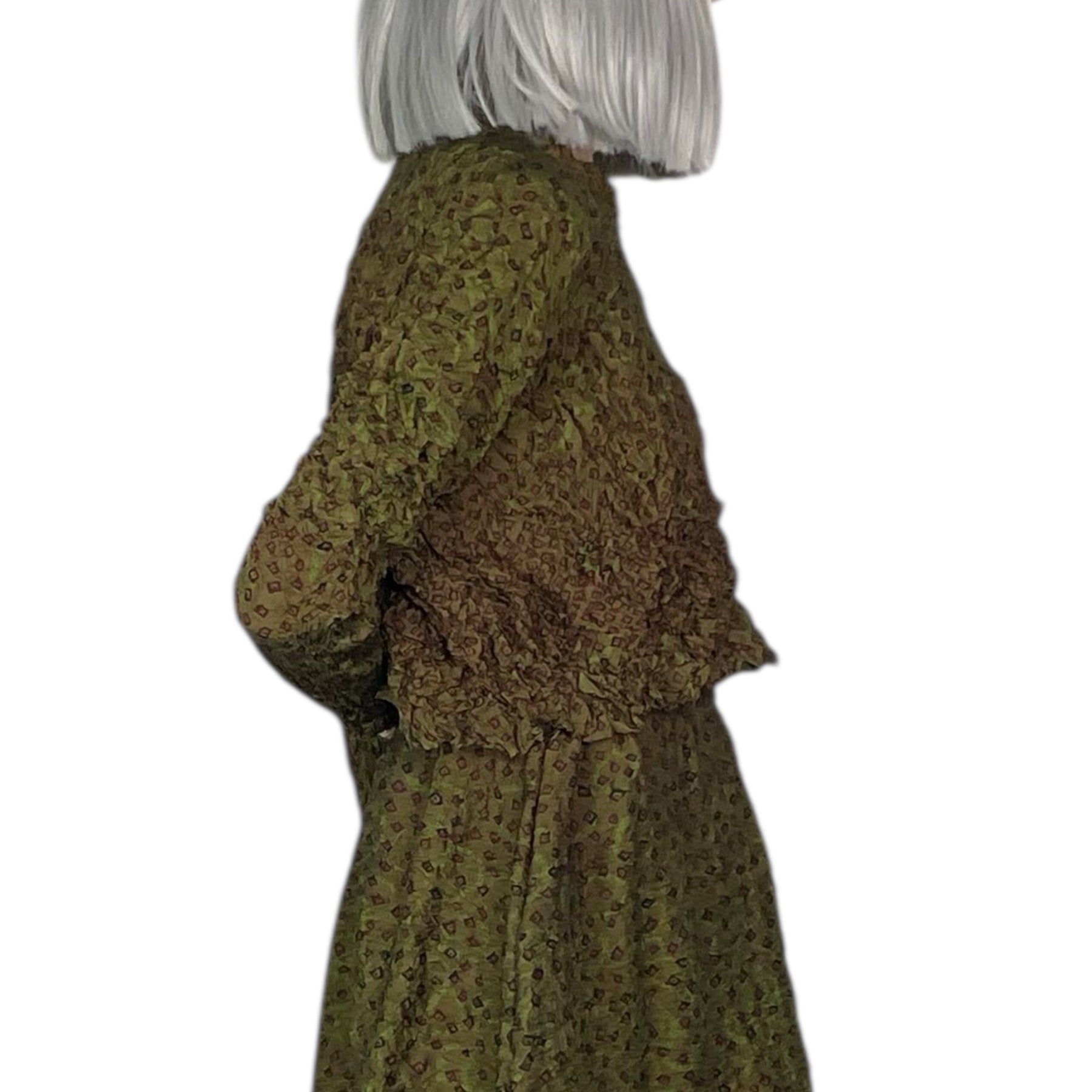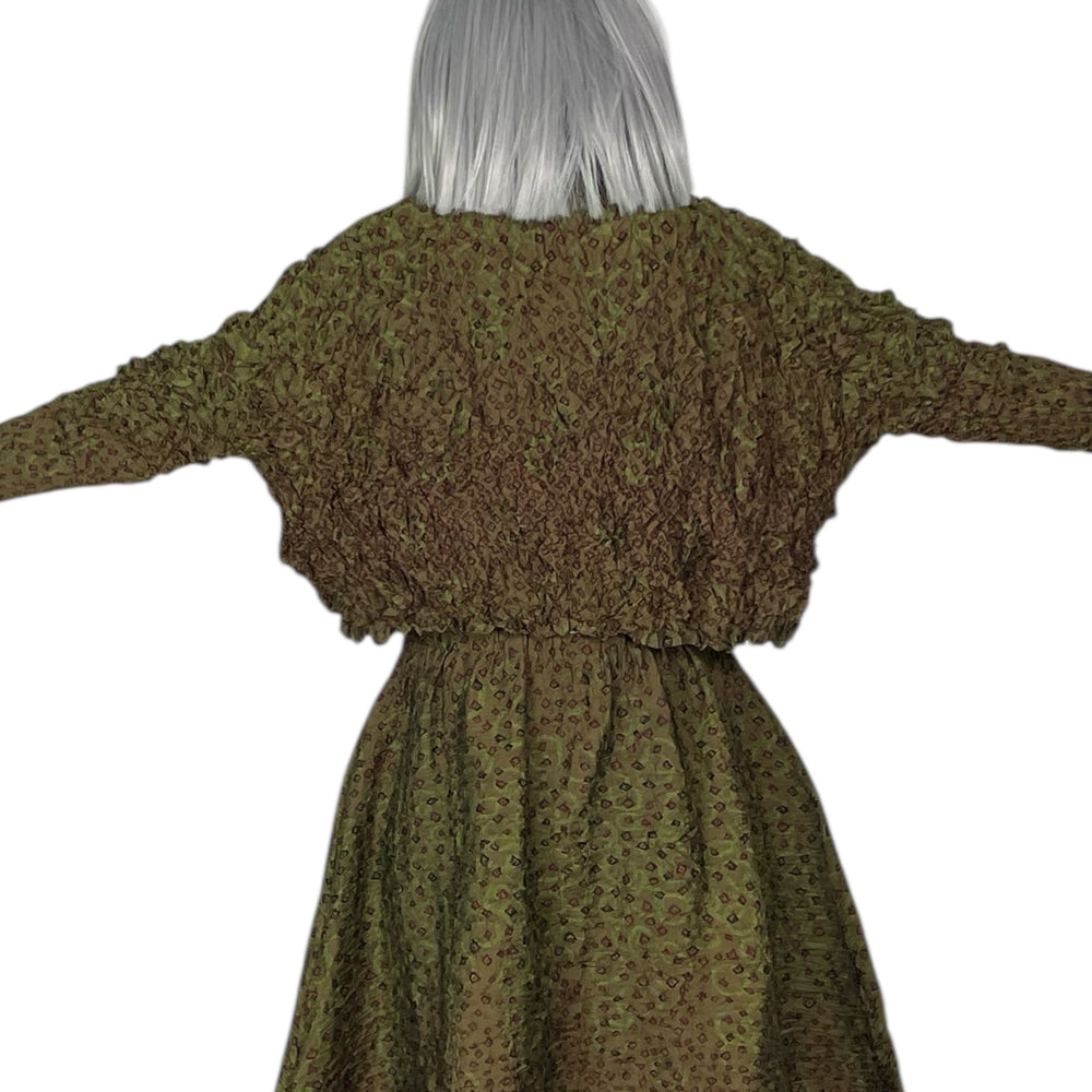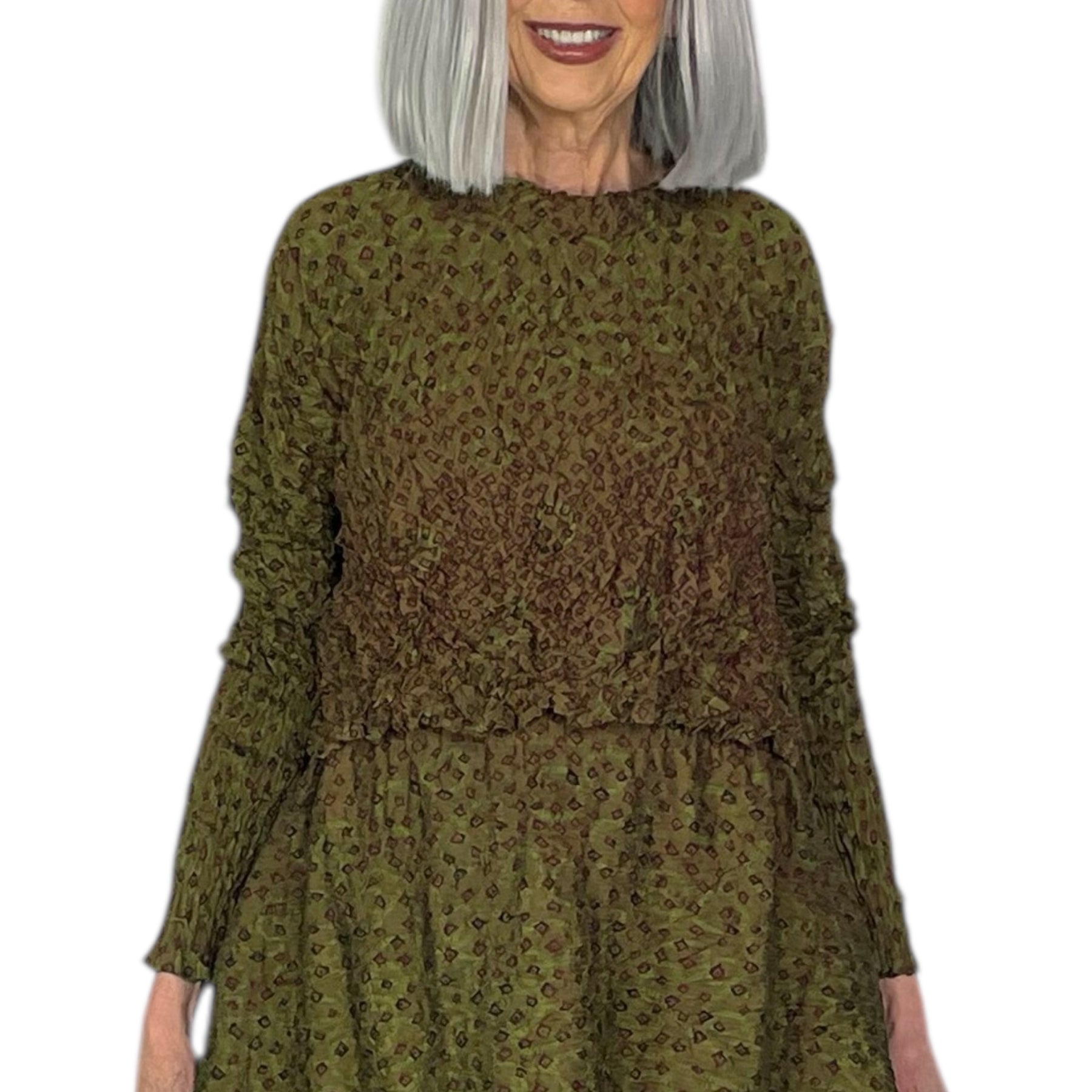 Shibori crush pleated crop top with long sleeves and a round neckline.