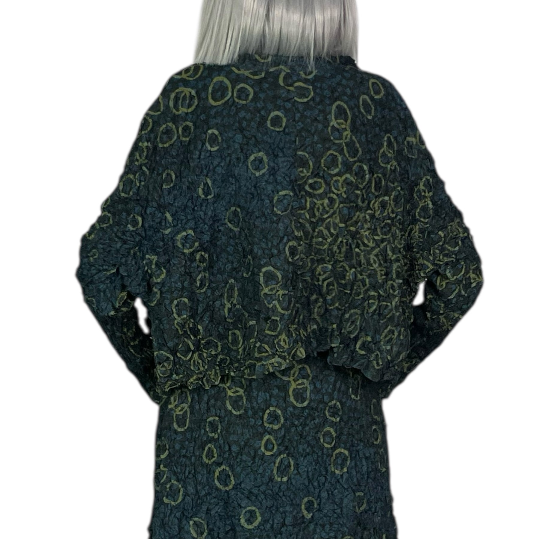Shibori crush pleated crop shirt. Long sleeves, round neckline, and snap front closure. Wide silhouette.