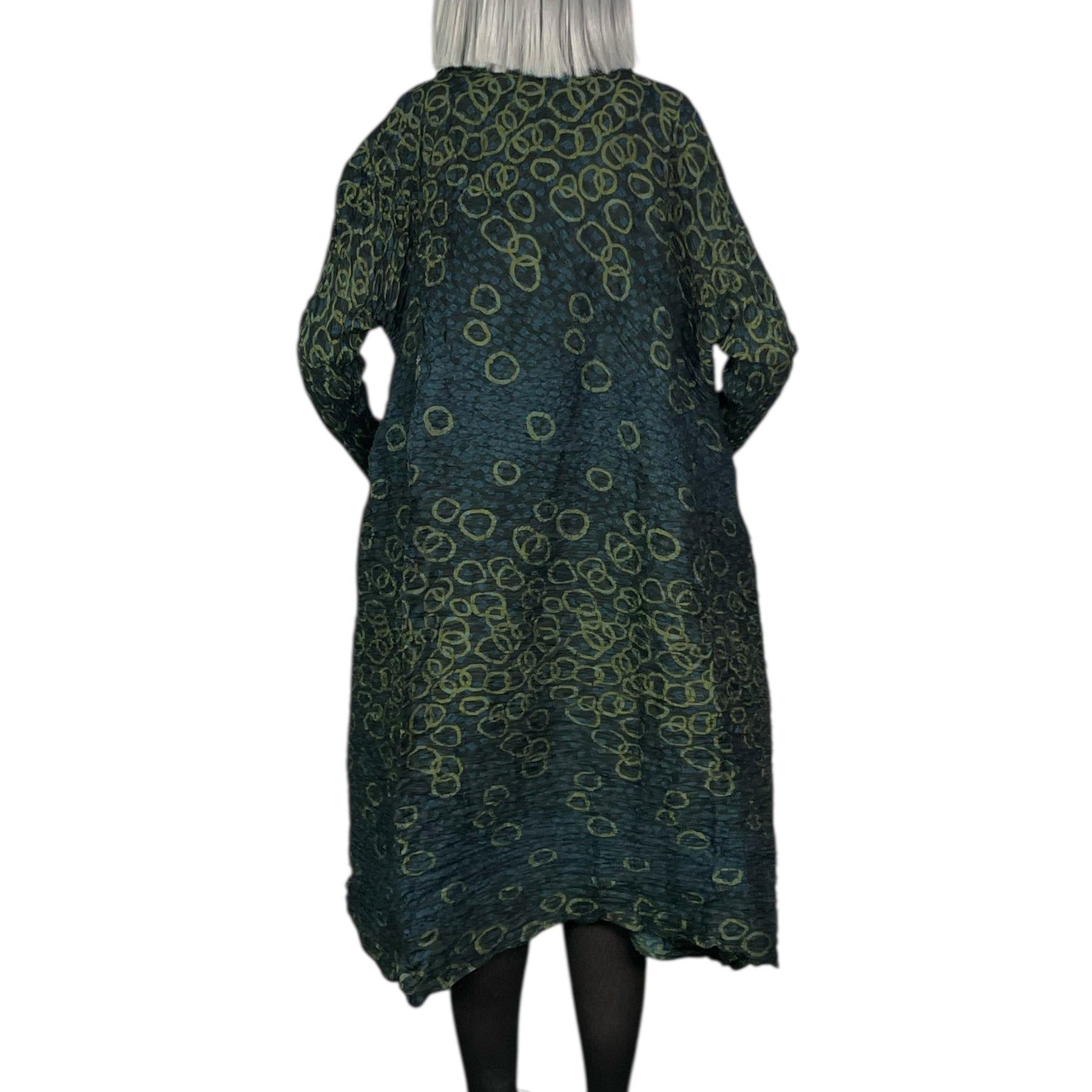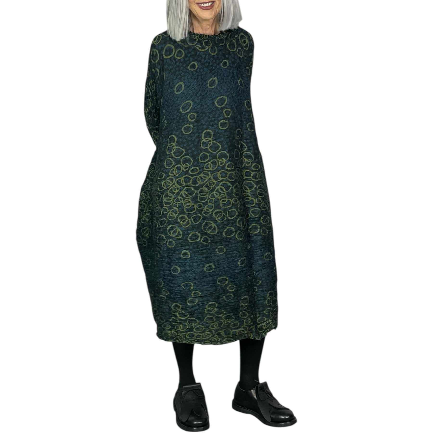 Shibori horizontal pleated dress with long sleeves and a round neckline.  Two side pockets, wide silhouette.