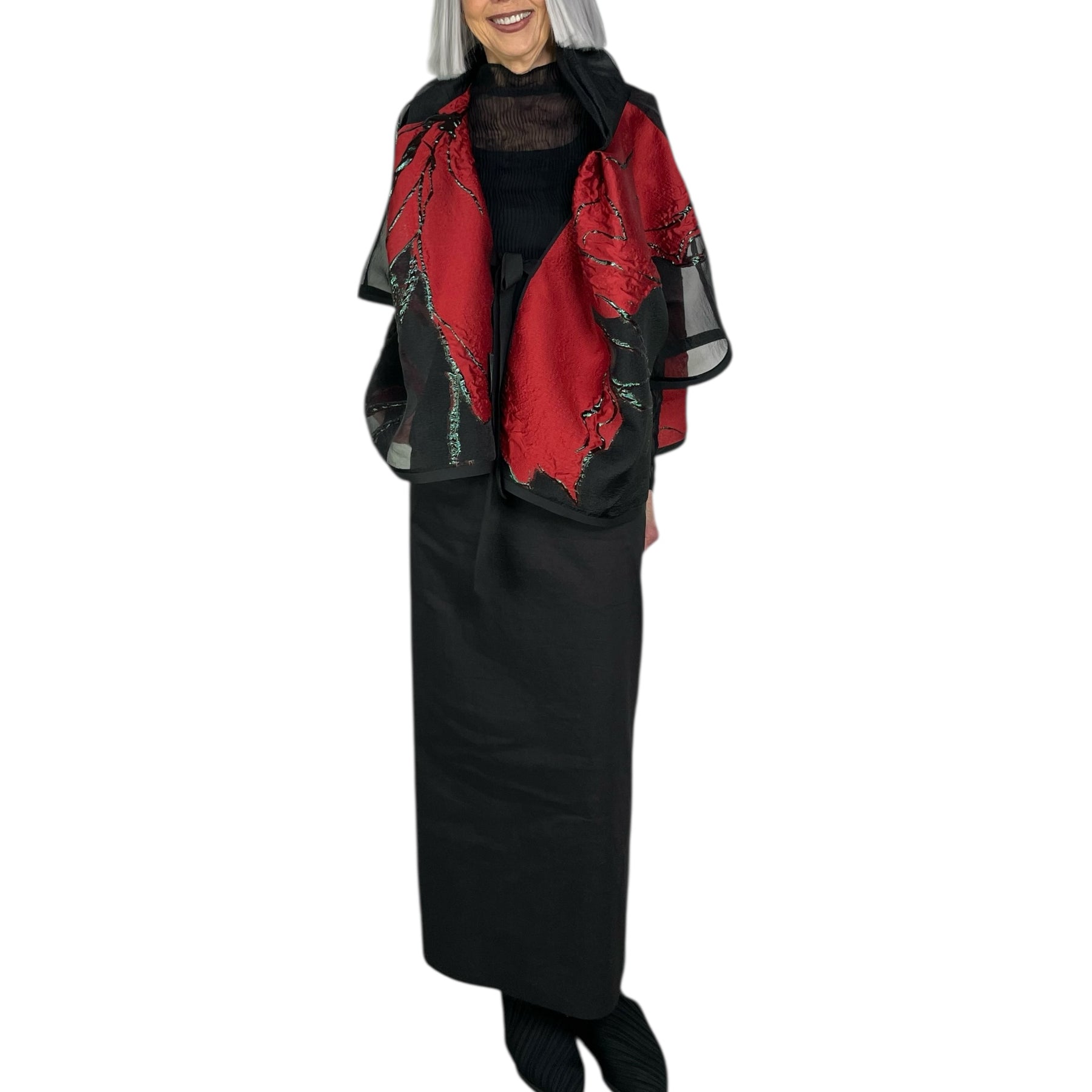 Short sleeve kimono style jacket with tie closure. Metallic brocade and sheer fabric. Generous fit.