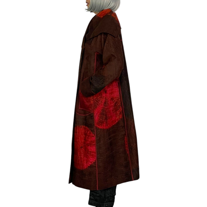 Reversible A-line coat with long sleeves, shawl collar and double breasted snap front closure. On seam pockets on front side, patch pockets on reverse side. Shibori dyed 4-layer vintage saris fabric with hand stitches throughout. Relaxed fit.